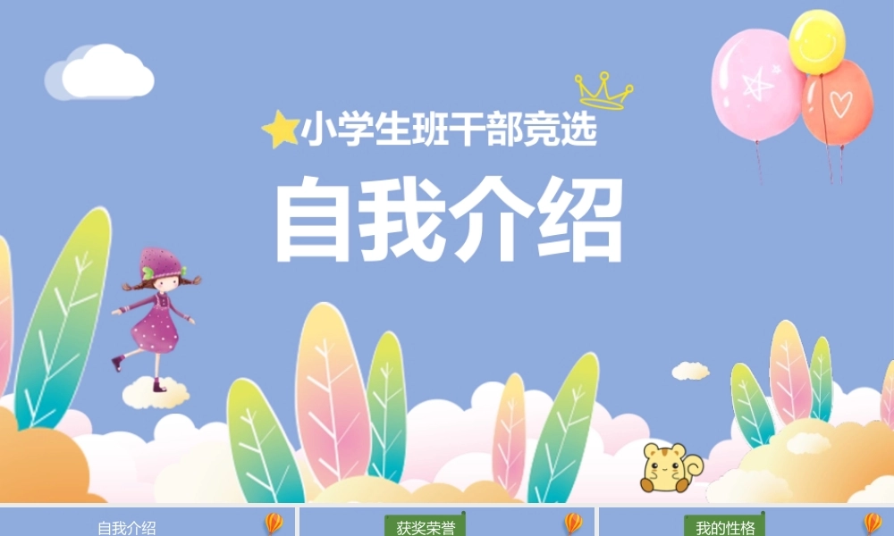 小学生班干部竞选自我介绍自我介绍姓名班级生日小包子三年级二班2015.07.01获奖荣誉我的性格活泼开朗热心善良友好诚实我的兴趣画画唱歌跳舞读书练字打球我的梦想我的梦想是当一个科学家,为我们的祖国贡献一份力...