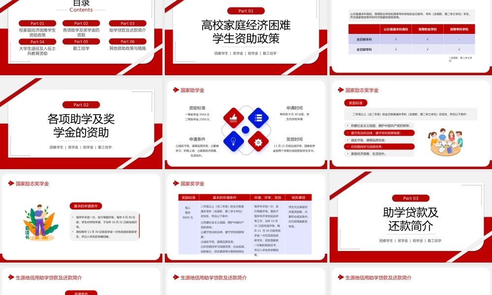 国家资助政策宣传困难学生 | 奖学金 | 助学金 | 勤工俭学资助政策与措施PLEASE ENTER YOUR ENGLISH TITLE HERE汇报人:目录ContentsPart 02各项助学及奖学金的资助Part 05勤工俭学Part 06其他资助...