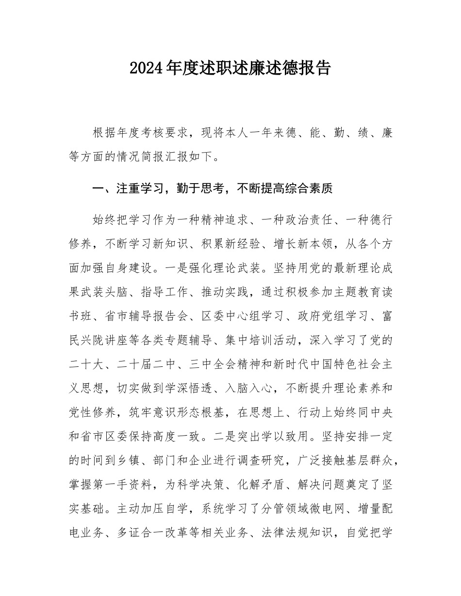 2024 年度述职述廉述德报告 根据年度考核要求,现将本人一年来德、能、勤、绩、廉等方面的情况简报汇报如下。 一、注重学习,勤于思考,不断提高综合素质 始终把学习作为一种精神追求、一种政治责任、一种德...