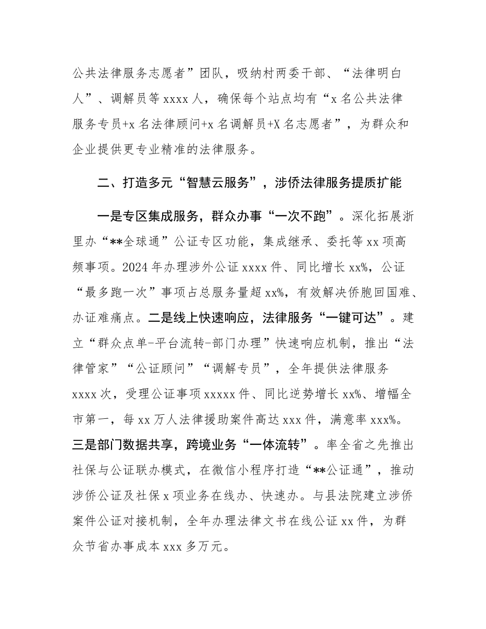 2025 年县司法局关于公共法律服务圈的汇报交流材料 2024 年来,县司法局在市局的精心指导下,深入学习贯彻法治思想,立足侨乡资源,创新服务模式,优化服务供给,聚力打造侨乡“xx 分钟公共法律服务圈”。获...