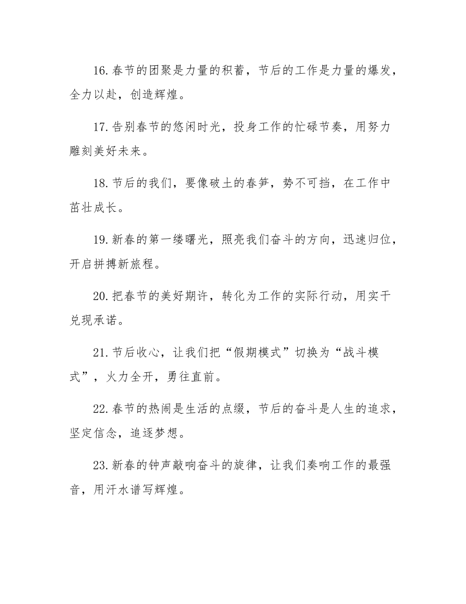 春节后收心工作动员会讲话金句 40 例 1.春节的热闹已悄然落幕,奋斗的篇章才刚刚开启,让我们迅速收心,以崭新的姿态奔赴工作的战场。 2.假期的欢乐是生活的调味剂,节后的拼搏才是人生的主色调,拿起“奋斗...