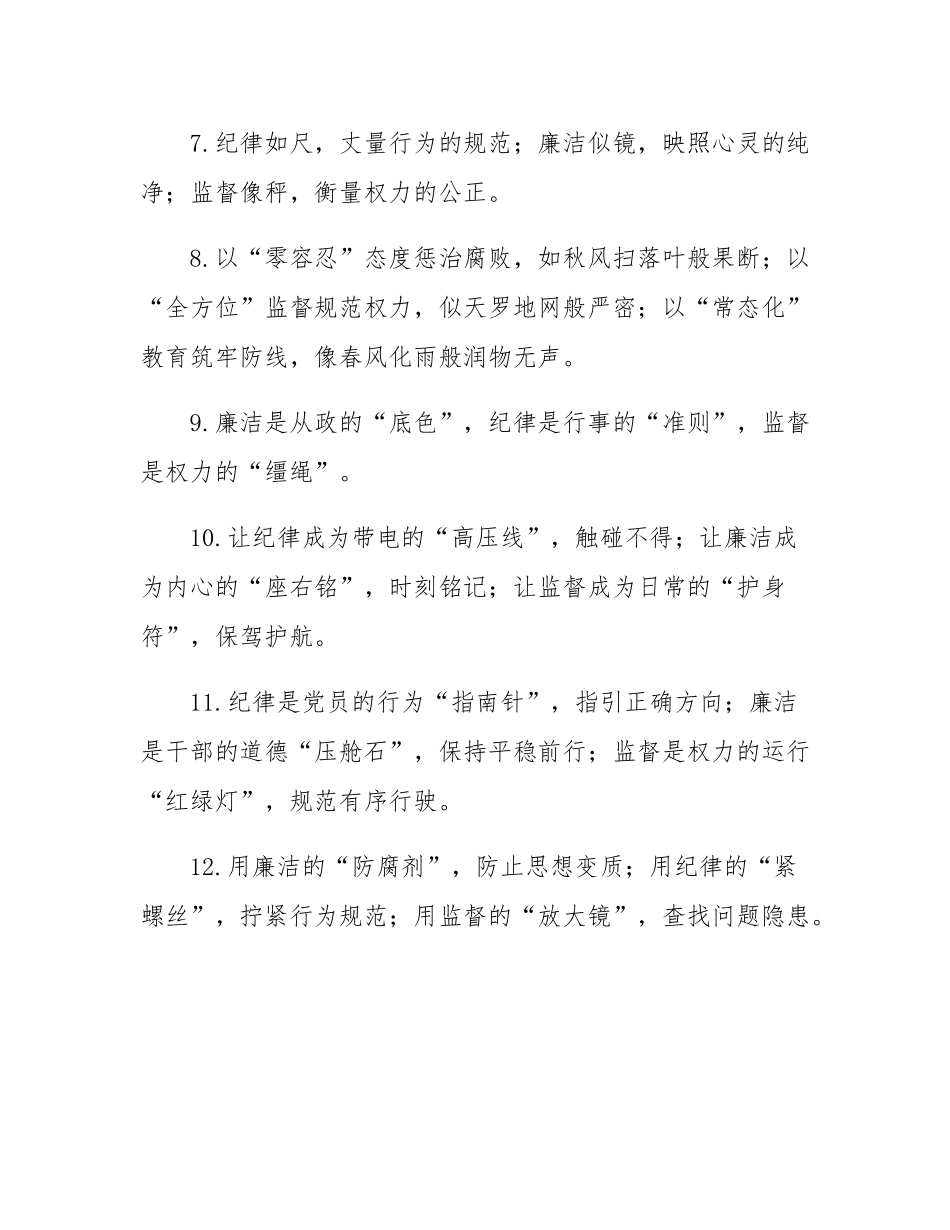 廉政建设类写作金句 30 例 1.廉洁是党员干部的政治“生命线”,纪律是行为的“警戒线”,监督是权力的“安全线”。 2.以廉洁为笔,绘就政治清明画卷;以纪律为墨,书写风清气正篇章;以监督为纸,承载从严治...