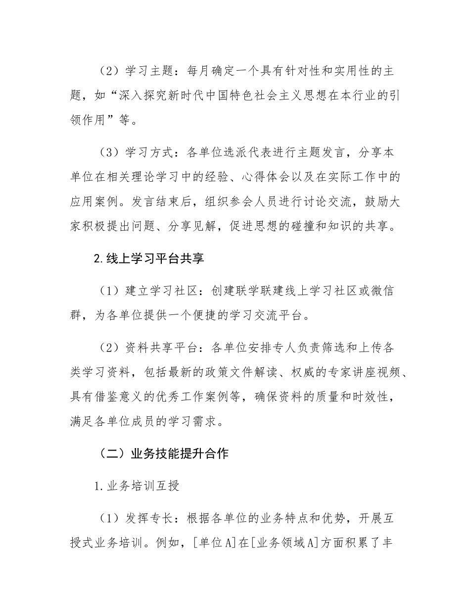 区局联学联建活动方案 一、活动目的 为进一步加强各单位之间的交流与合作,实现资源共享、优势互补,推动各单位共同发展,提升党员及员工的综合素质,特举办此次联学联建活动。通过共同学习、业务合作和文化交...
