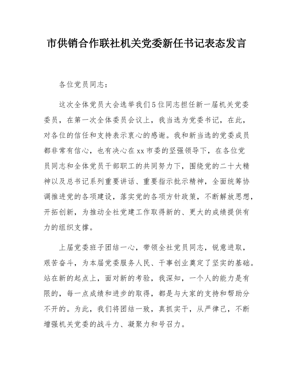 市供销合作联社机关党委新任书记表态发言 各位党员同志: 这次全体党员大会选举我们 5 位同志担任新一届机关党委委员,在第一次全体委员会议上,我当选为党委书记,在此,对各位的信任和支持表示衷心的感谢。...