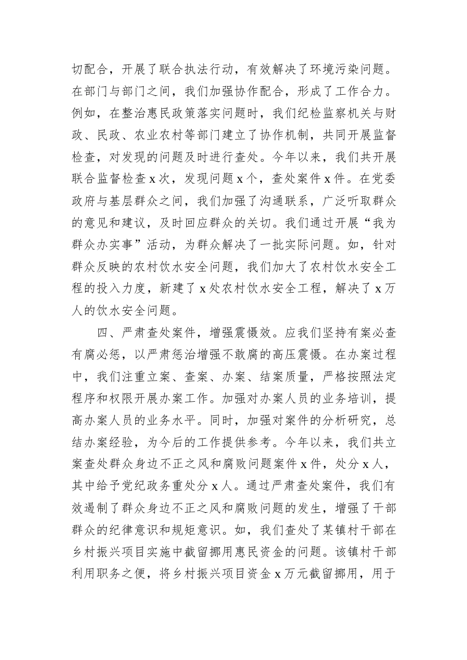 关于集中整治群众身边不正之风和腐败问题专项工作报告自全市专项工作启动以来,xx 县深入贯彻落实市委、市政府的决策部署,以严的基调、严的措施、严的氛围,扎实推进整治工作,努力让人民群众有更多的获得感、...