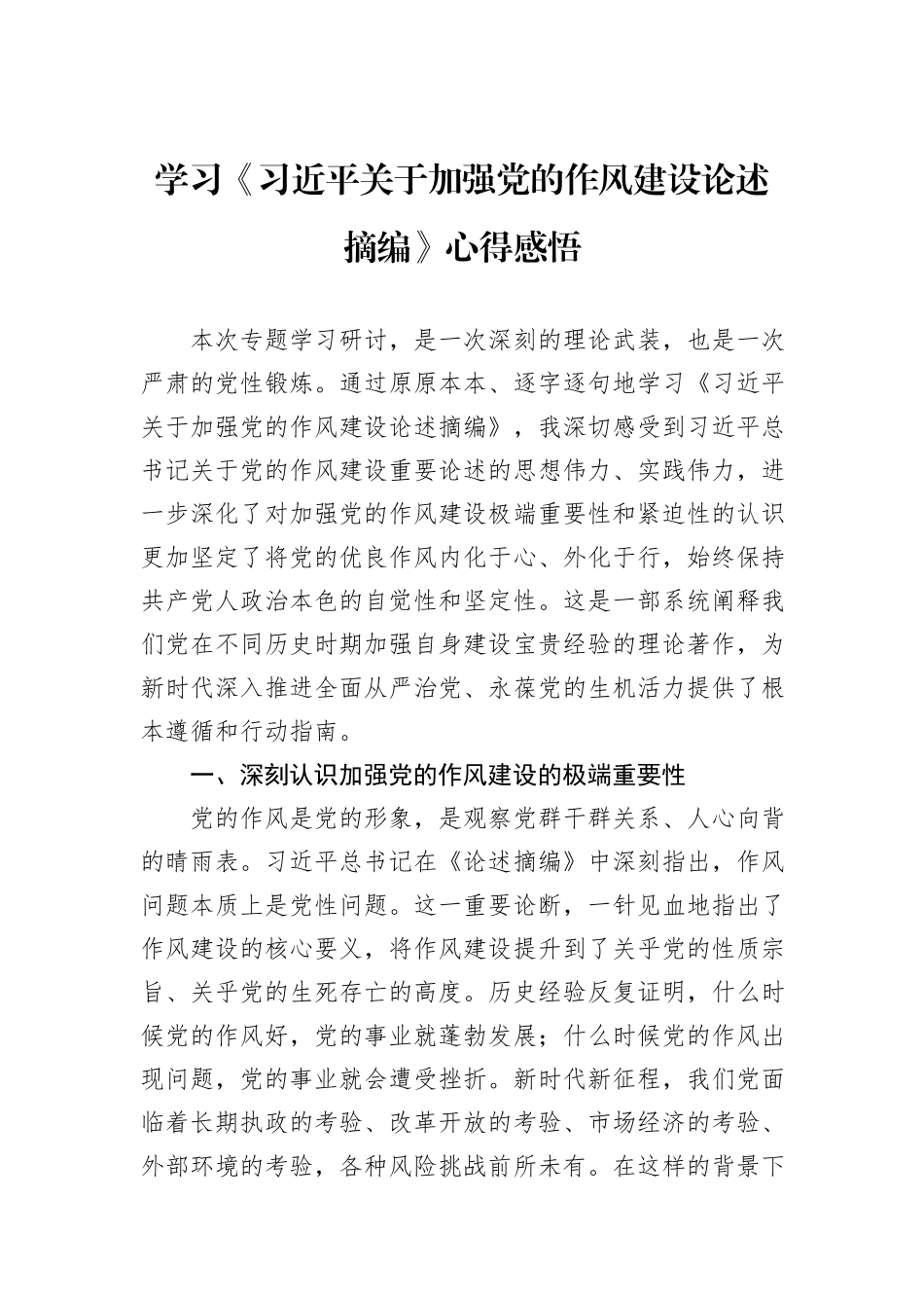学习《习近平关于加强党的作风建设论述摘编》心得感悟.docx_第1页