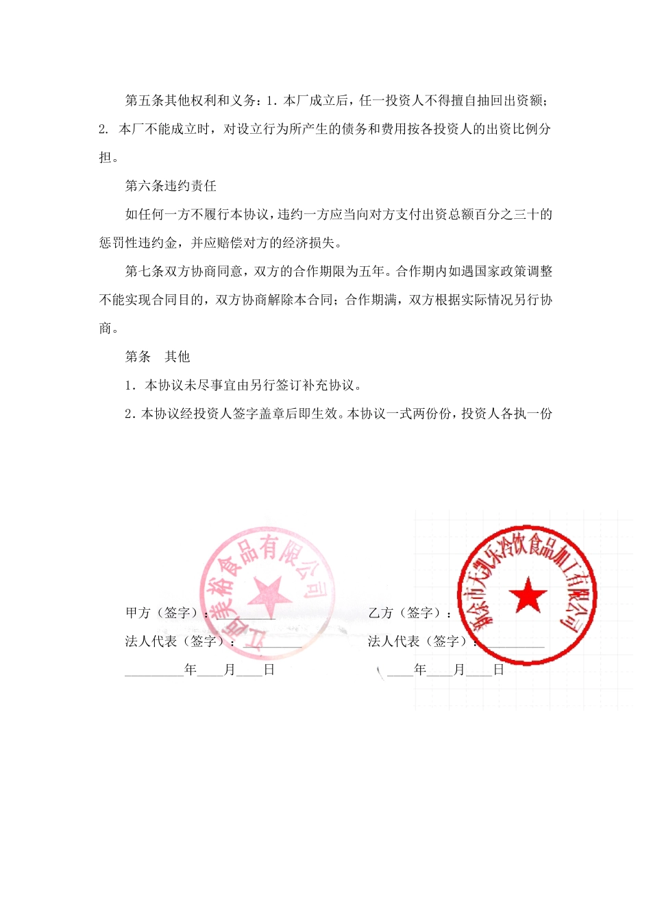合作办厂协议书甲方:江西美裕食品有限公司乙方:新余市天凯乐冷饮食品加工有限公司 甲乙双方本着自愿合作、平等友好、共同投资、共同受益、风险共担、利益共享的原则,经双方协商同意,在甲方所在地共同建造江...