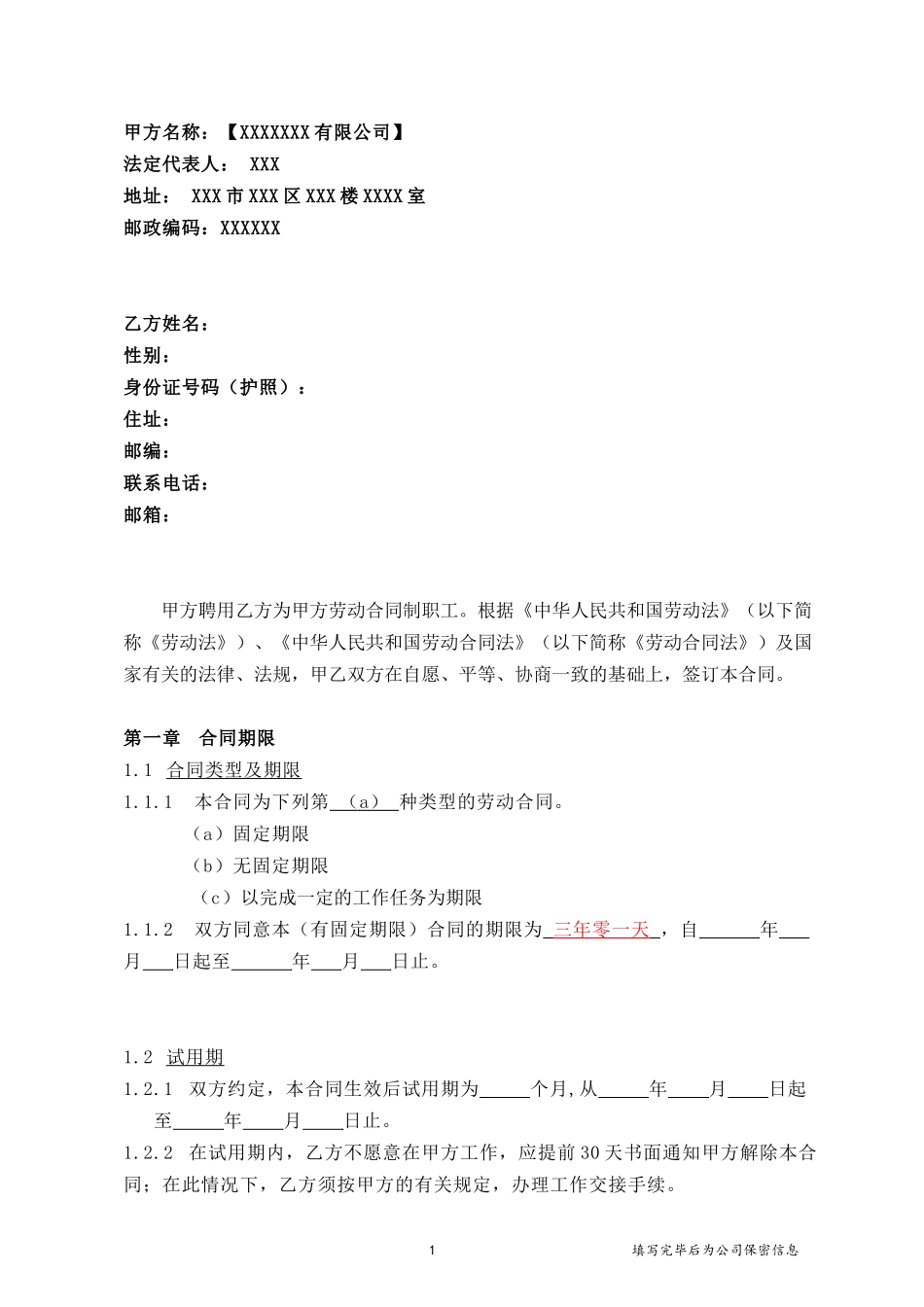 0 编号: 劳动合同甲 方: 乙 方: 签订日期: 年 月 日劳动合同 1 填写完毕后为公司保密信息甲方名称:【XXXXXXX 有限公司】法定代表人: XXX地址: XXX 市 XXX 区 XXX 楼 XXXX 室邮政编码...