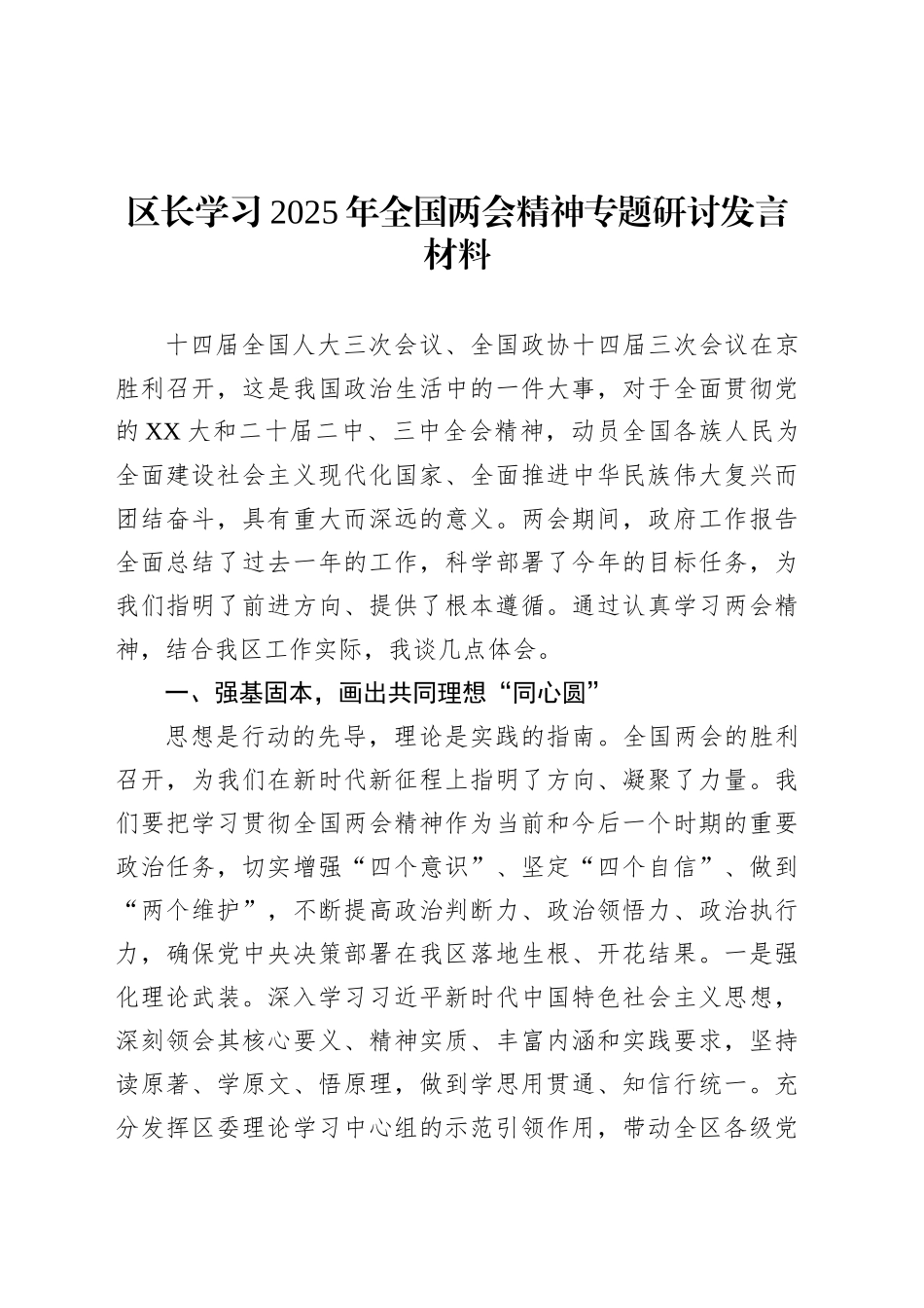 区长学习2025年全国两会精神专题研讨发言材料.docx_第1页