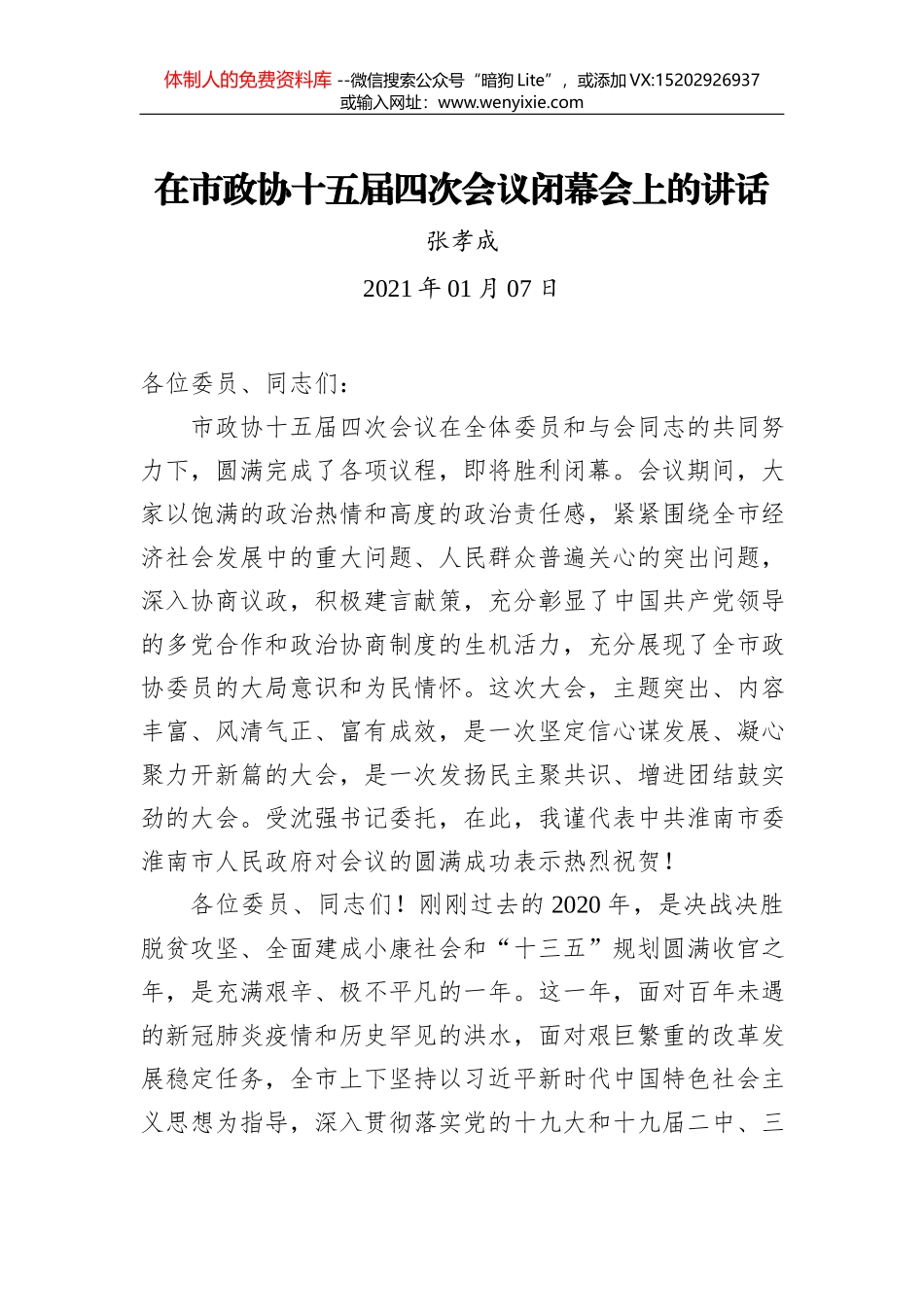 体制人的免费资料库 --微信搜索公众号“暗狗 Lite”,或添加 VX:15202926937或输入网址:www.wenyixie.com在市政协十五届四次会议闭幕会上的讲话张孝成2021 年 01 月 07 日各位委员、同志们:市政协十五...