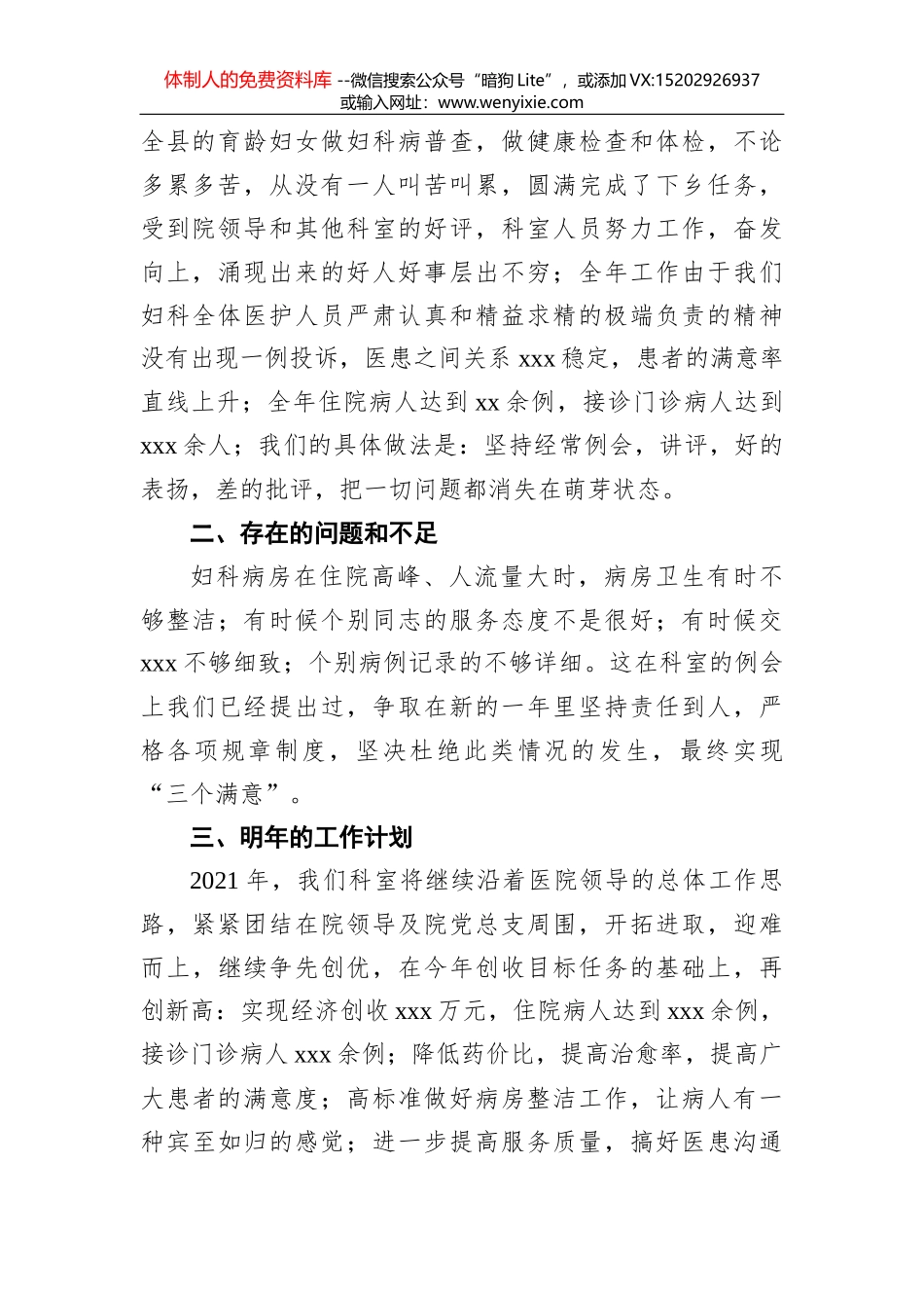 体制人的免费资料库 --微信搜索公众号“暗狗 Lite”,或添加 VX:15202926937或输入网址:www.wenyixie.com2020 医院年终工作总结范文 4xx 县人民医院妇科在 xx 院长和领导班子的正确领导下在科室全体医护...