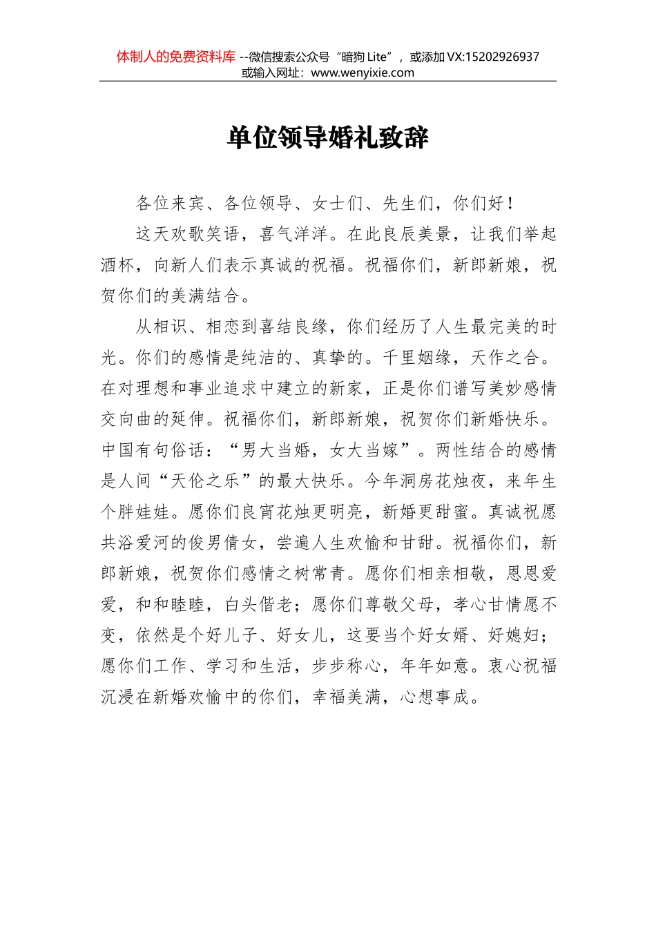 体制人的免费资料库 --微信搜索公众号“暗狗 Lite”,或添加 VX:15202926937或输入网址:www.wenyixie.com单位领导婚礼致辞各位来宾、各位领导、女士们、先生们,你们好!这天欢歌笑语,喜气洋洋。在此良辰美...