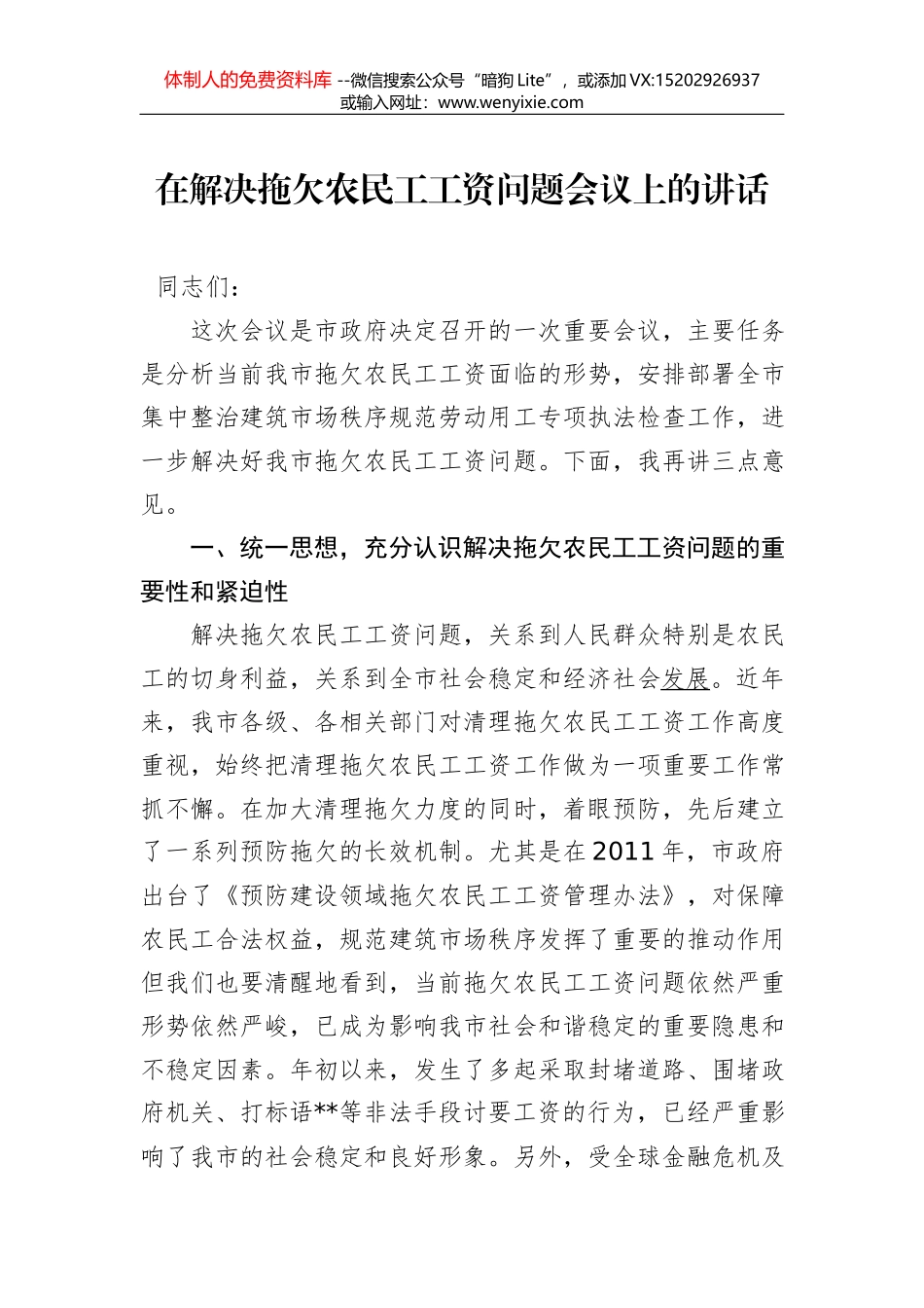 体制人的免费资料库 --微信搜索公众号“暗狗 Lite”,或添加 VX:15202926937或输入网址:www.wenyixie.com在解决拖欠农民工工资问题会议上的讲话同志们:这次会议是市政府决定召开的一次重要会议,主要任务是...