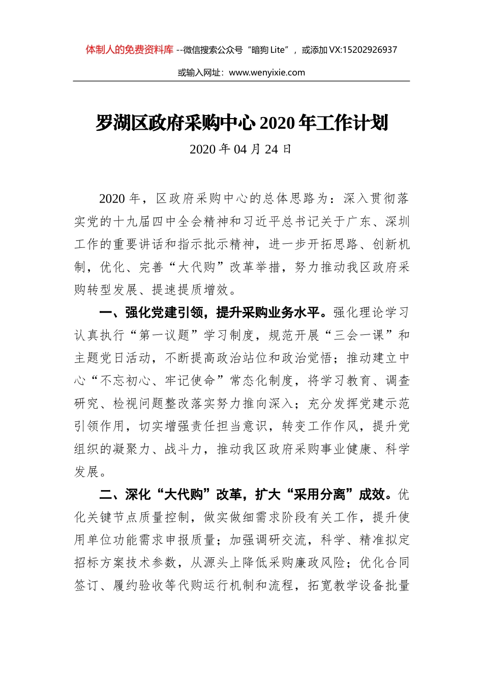 体制人的免费资料库 --微信搜索公众号“暗狗 Lite”,或添加 VX:15202926937或输入网址:www.wenyixie.com罗湖区政府采购中心 2020 年工作计划2020 年 04 月 24 日2020 年,区政府采购中心的总体思路...