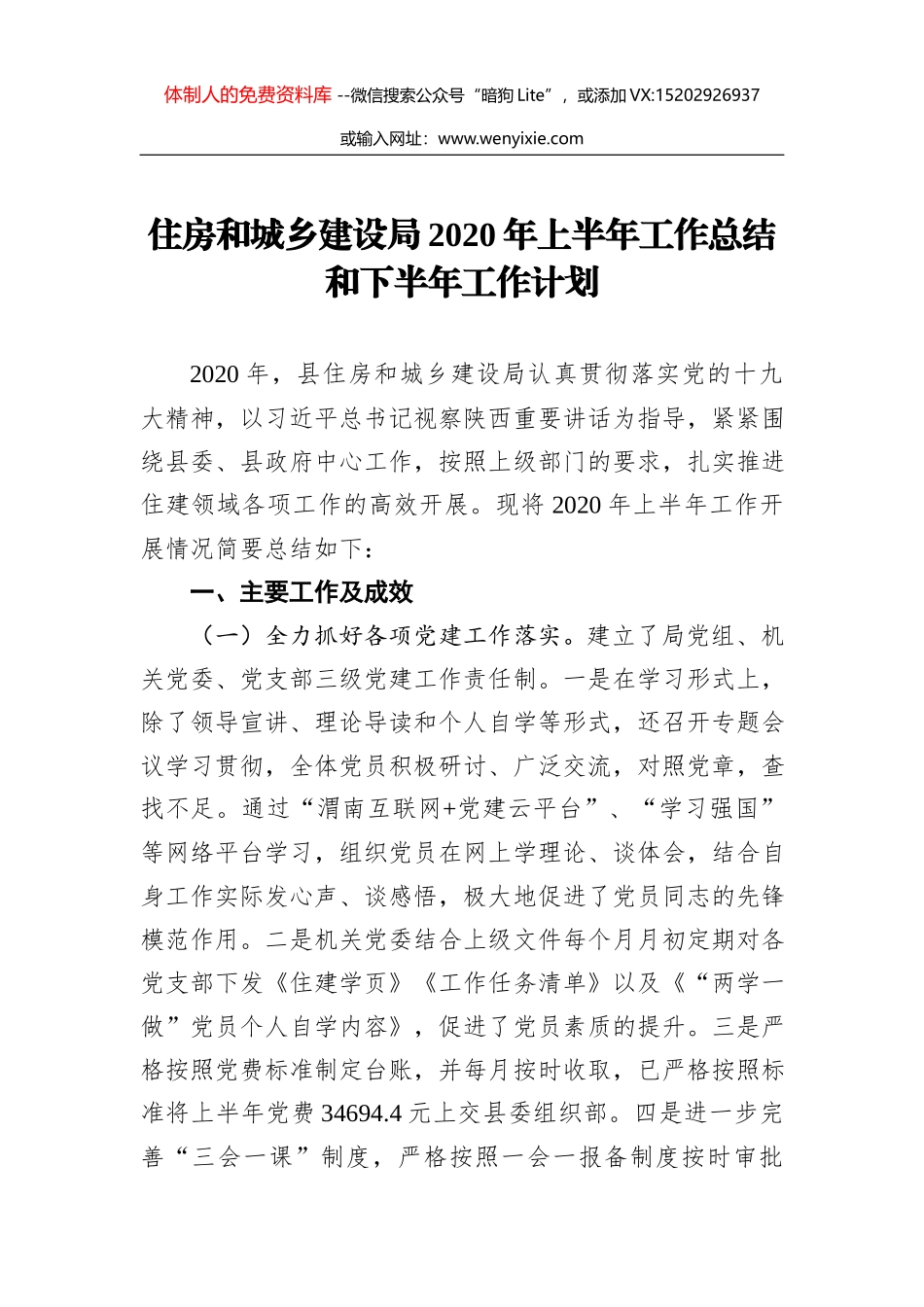 体制人的免费资料库 --微信搜索公众号“暗狗 Lite”,或添加 VX:15202926937或输入网址:www.wenyixie.com住房和城乡建设局 2020 年上半年工作总结和下半年工作计划2020 年,县住房和城乡建设局认真贯彻落...
