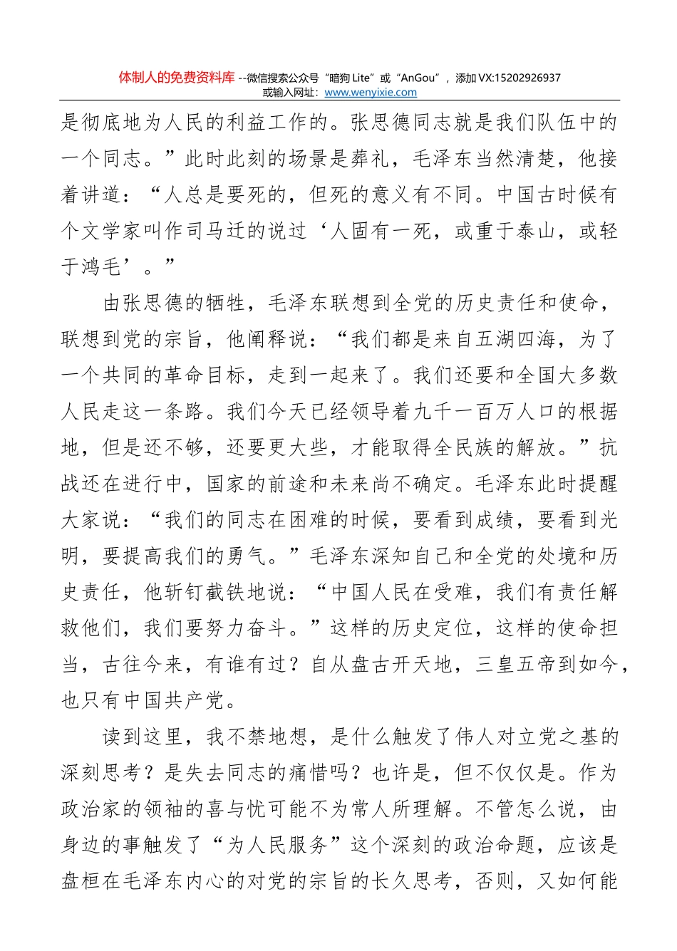 体制人的免费资料库 --微信搜索公众号“暗狗 Lite”或“AnGou”,添加 VX:15202926937或输入网址:www.wenyixie.com夜读《为人民服务》有感发表时间:2021-01-26 来源:旗帜网 谢煜桐读毛泽东同志的文章,在...