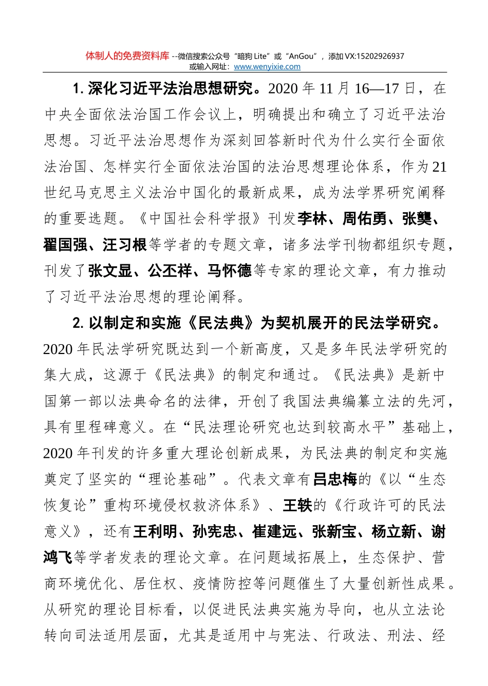 体制人的免费资料库 --微信搜索公众号“暗狗 Lite”或“AnGou”,添加 VX:15202926937或输入网址:www.wenyixie.com2020 年法学研究发展报告发表时间:2021-01-18 来源:中国社会科学网-中国社会科学报中国...