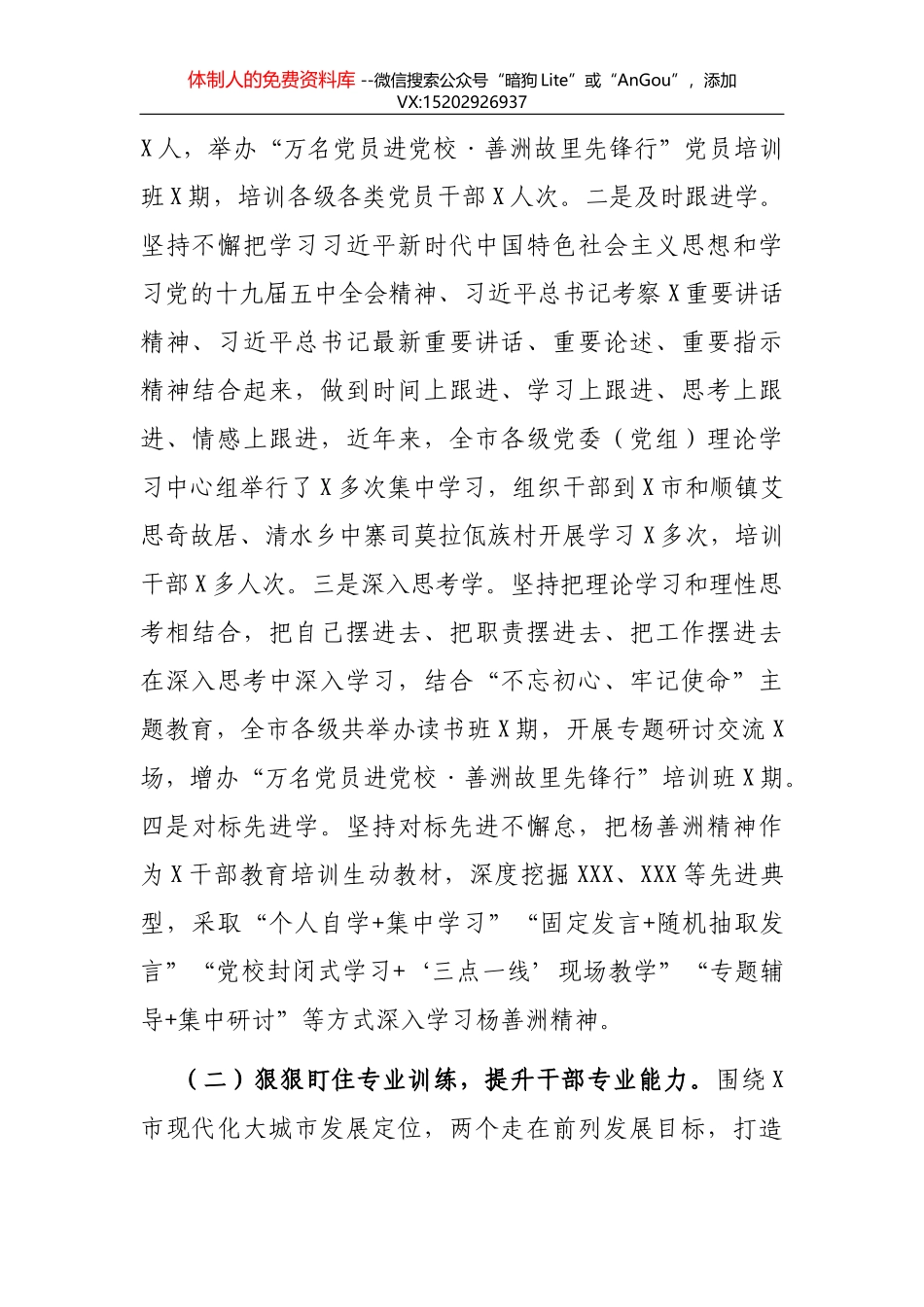 体制人的免费资料库 --微信搜索公众号“暗狗 Lite”或“AnGou”,添加VX:15202926937干部教育培训工作汇报X 市干部教育培训工作在市委的正确领导下,在省委组织部的关心支持下,坚持以习近平新时代中国特色社...