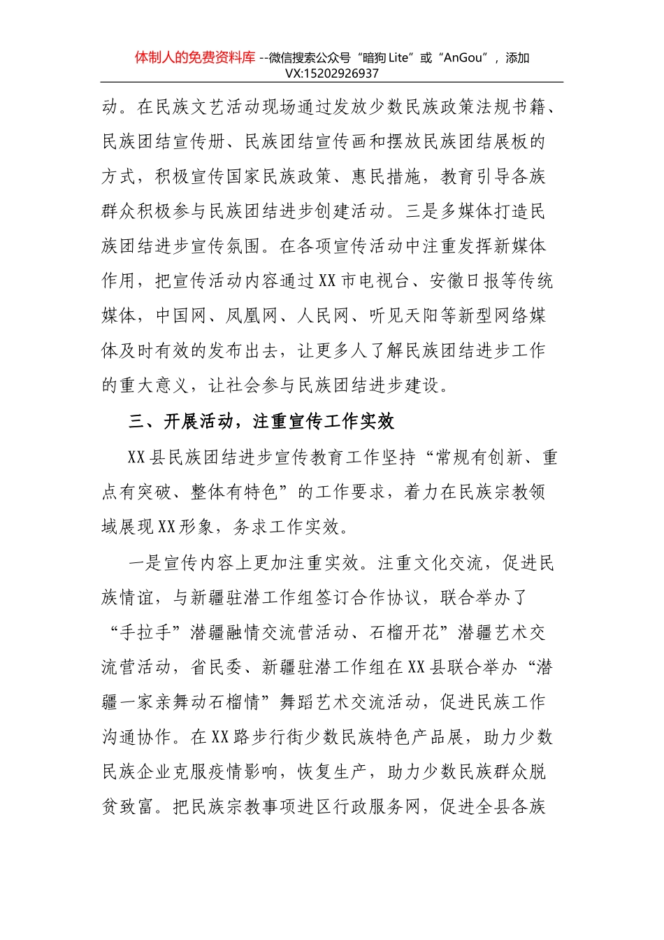 体制人的免费资料库 --微信搜索公众号“暗狗 Lite”或“AnGou”,添加VX:15202926937XX 县 2021 年民族团结进步宣传月工作总结根据 XX 市委宣传部、市委统战部、市教育局、市民委《关于印发 2021 年全市...