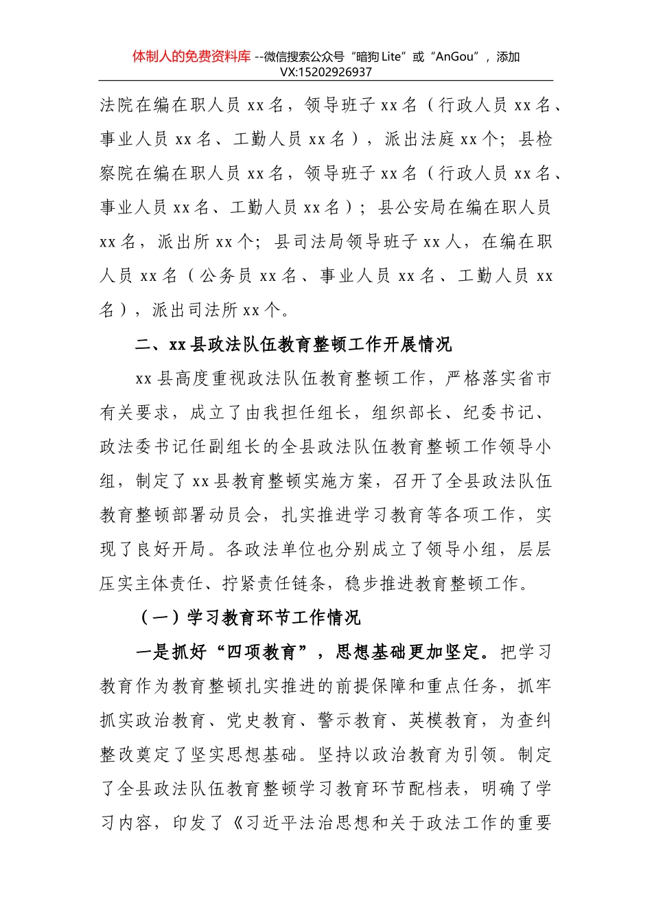 体制人的免费资料库 --微信搜索公众号“暗狗 Lite”或“AnGou”,添加VX:152029269372021 年县委书记在市政法队伍教育整顿座谈会上的汇报发言各位领导: 市政法队伍教育整顿第 xx 指导组莅临我县指导工作,...