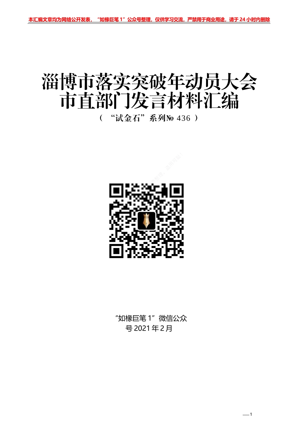 本汇编文章均为网络公开发表,“如椽巨笔 1 ”公众号整理,仅供学习交流,严禁用于商业用途,请于 24 小时内删除 —1淄博市落实突破年动员大会市直部门发言材料汇编( “试金石”系列№ 436 )“如椽巨笔...