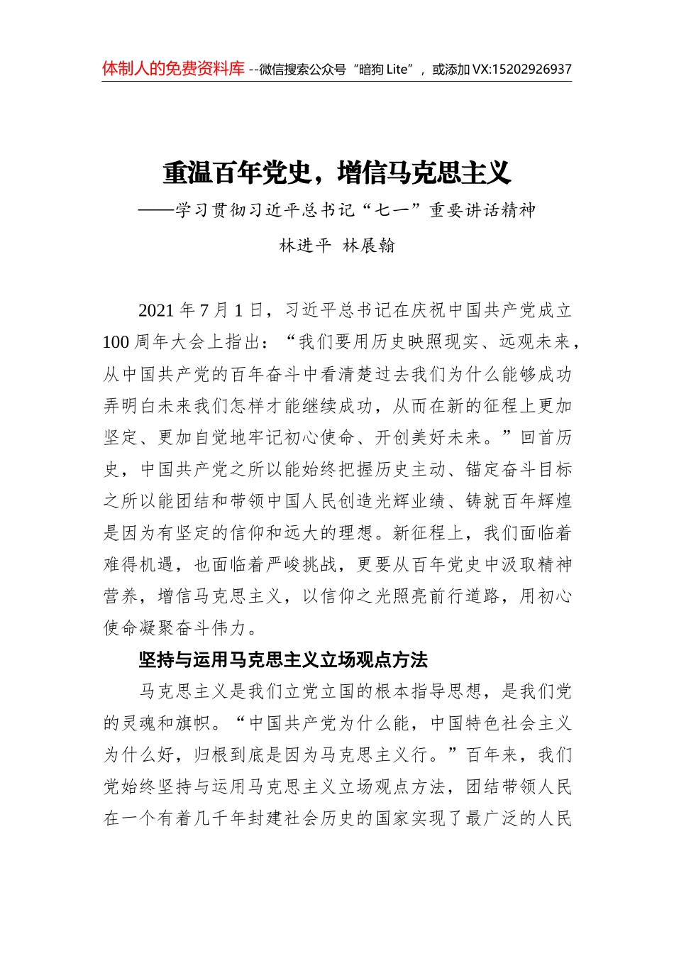 体制人的免费资料库 --微信搜索公众号“暗狗 Lite”,或添加 VX:15202926937重温百年党史,增信马克思主义——学习贯彻习近平总书记“七一”重要讲话精神林进平�林展翰2021 年 7 月 1 日,习近平总书记...
