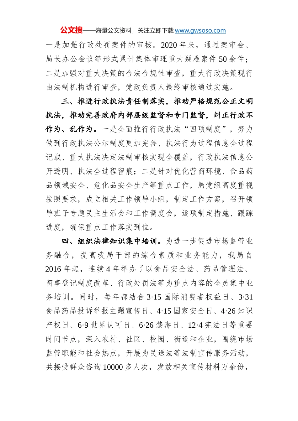 公文搜——海量公文资料,关注立即下载 www.gwsoso.com临澧县市场监督管理局主要负责人履行推进法治建设第一责任人职责 2020 年度述职报告我局自 2015 年底成立以来,局党政主要负责人认真学习贯彻《党政主...