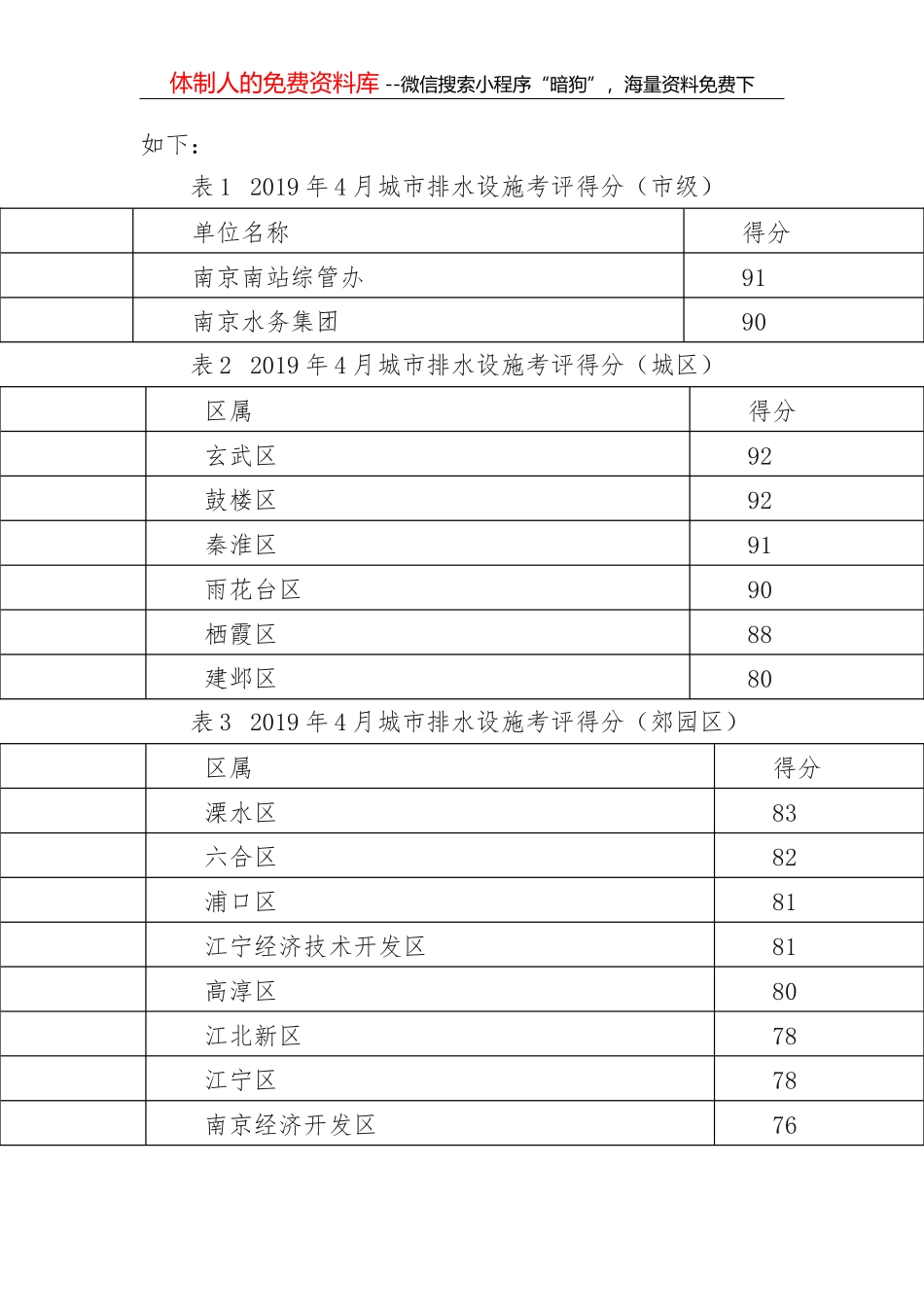 体制人的免费资料库 --微信搜索小程序“暗狗”,海量资料免费下关于 2019 年 4 月全市城市排水设施维护管理考评情况的通报各区水务局,各有关单位:2019 年 4 月,根据《南京市城市排水设施维护管理考核...