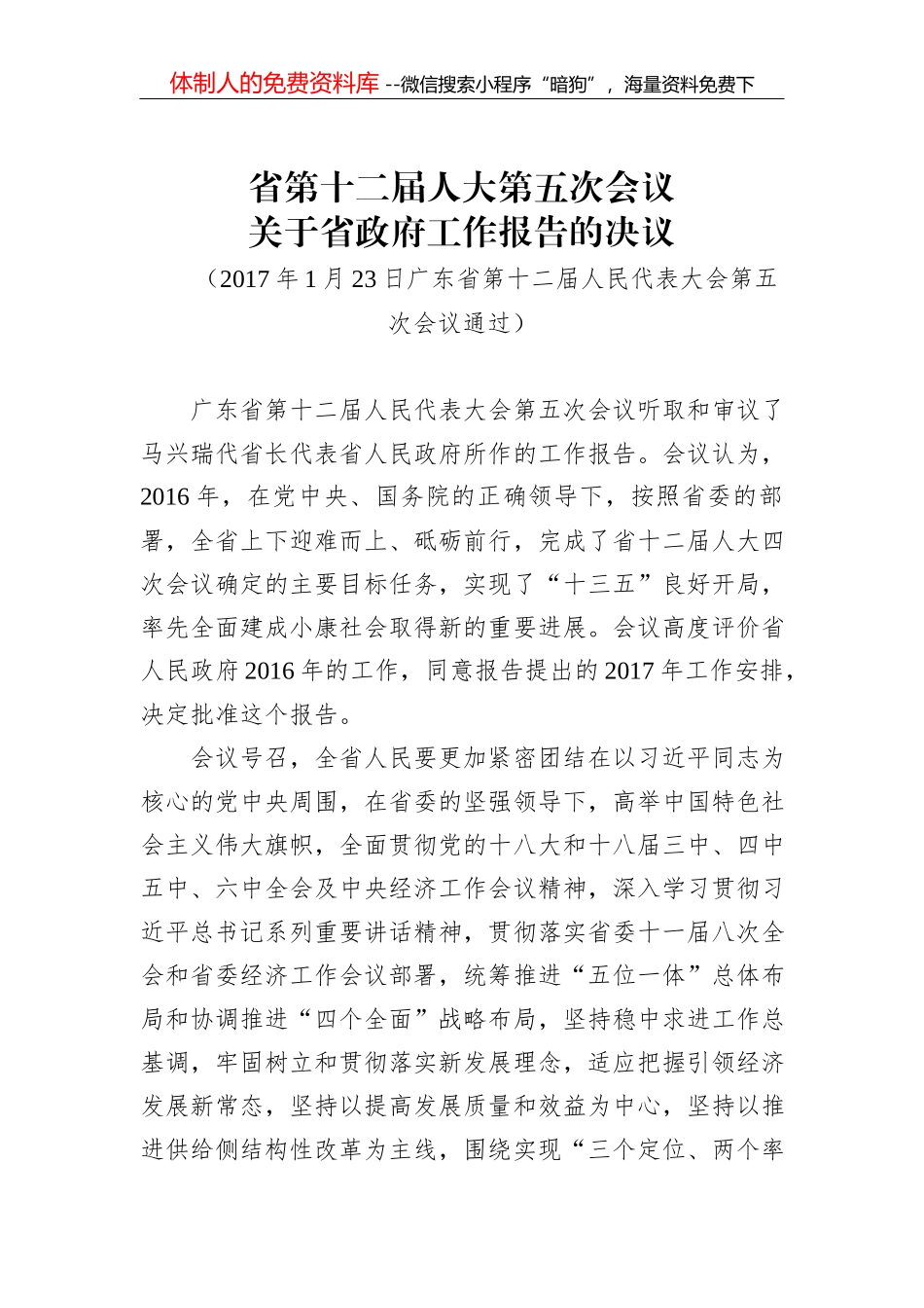 体制人的免费资料库 --微信搜索小程序“暗狗”,海量资料免费下省第十二届人大第五次会议关于省政府工作报告的决议(2017 年 1 月 23 日广东省第十二届人民代表大会第五次会议通过)广东省第十二届人民代表...