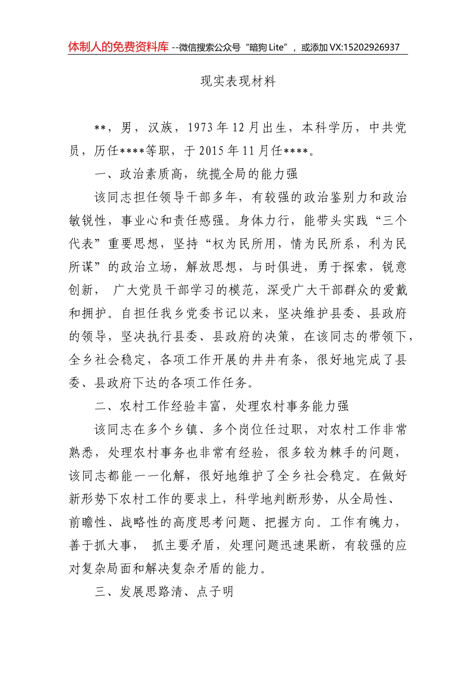 体制人的免费资料库 --微信搜索公众号“暗狗 Lite”,或添加 VX:15202926937现实表现材料 **,男,汉族,1973 年 12 月出生,本科学历,中共党员,历任****等职,于 2015 年 11 月任****。一、政治素...