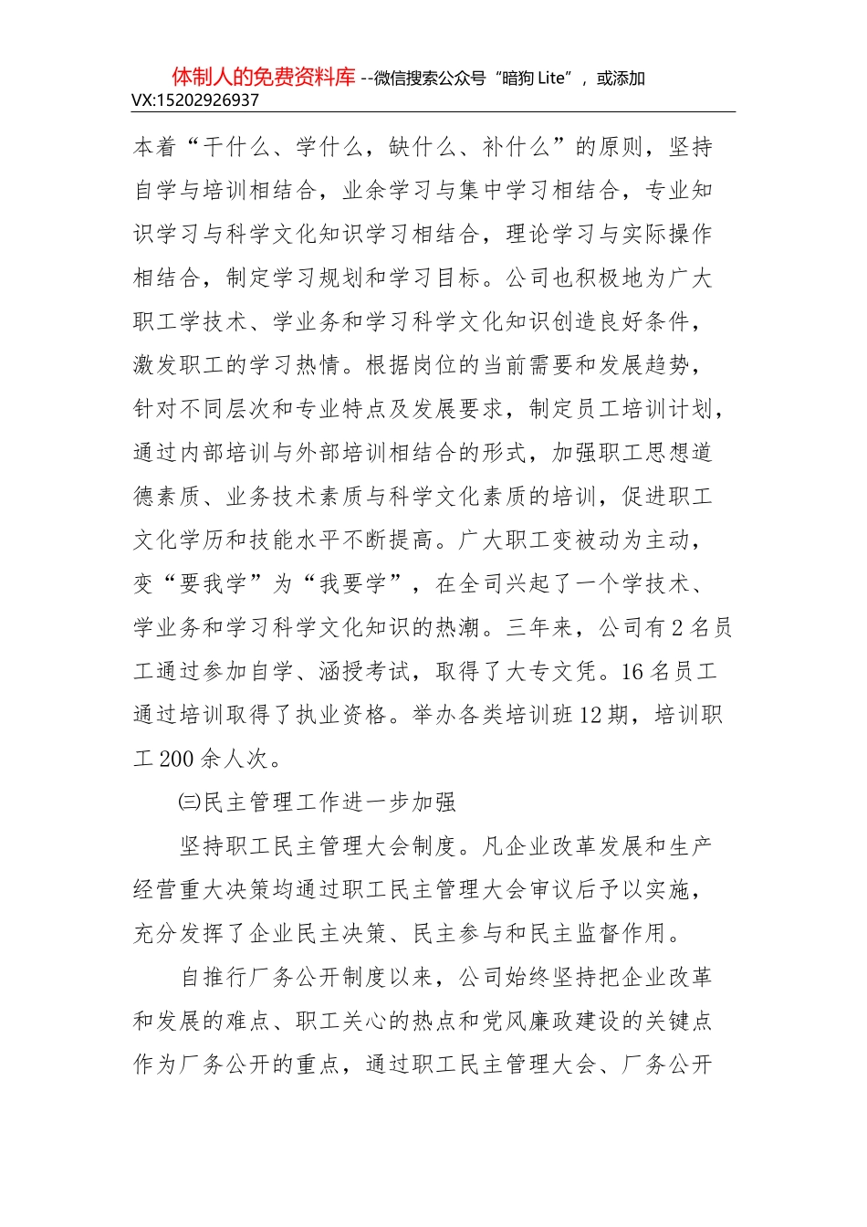 体制人的免费资料库 --微信搜索公众号“暗狗 Lite”,或添加VX:15202926937工会换届工作报告一、三年来的主要工作回顾XX 年至 2015 年是公司制定实施“xxx”战略发展规划,全面推进各项改革、建设和发展的三...