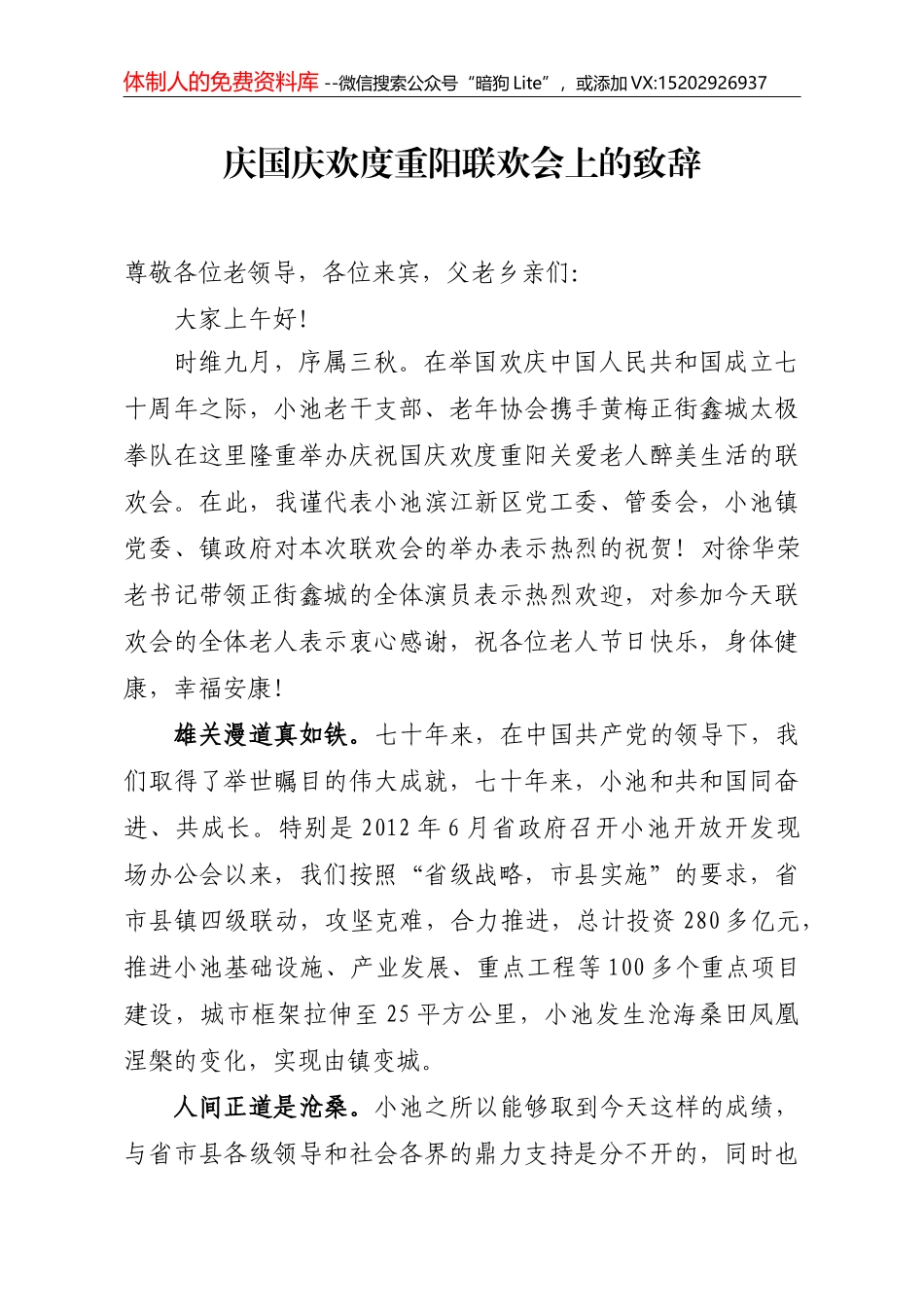 体制人的免费资料库 --微信搜索公众号“暗狗 Lite”,或添加 VX:15202926937庆国庆欢度重阳联欢会上的致辞尊敬各位老领导,各位来宾,父老乡亲们:大家上午好!时维九月,序属三秋。在举国欢庆中国人民共和国...
