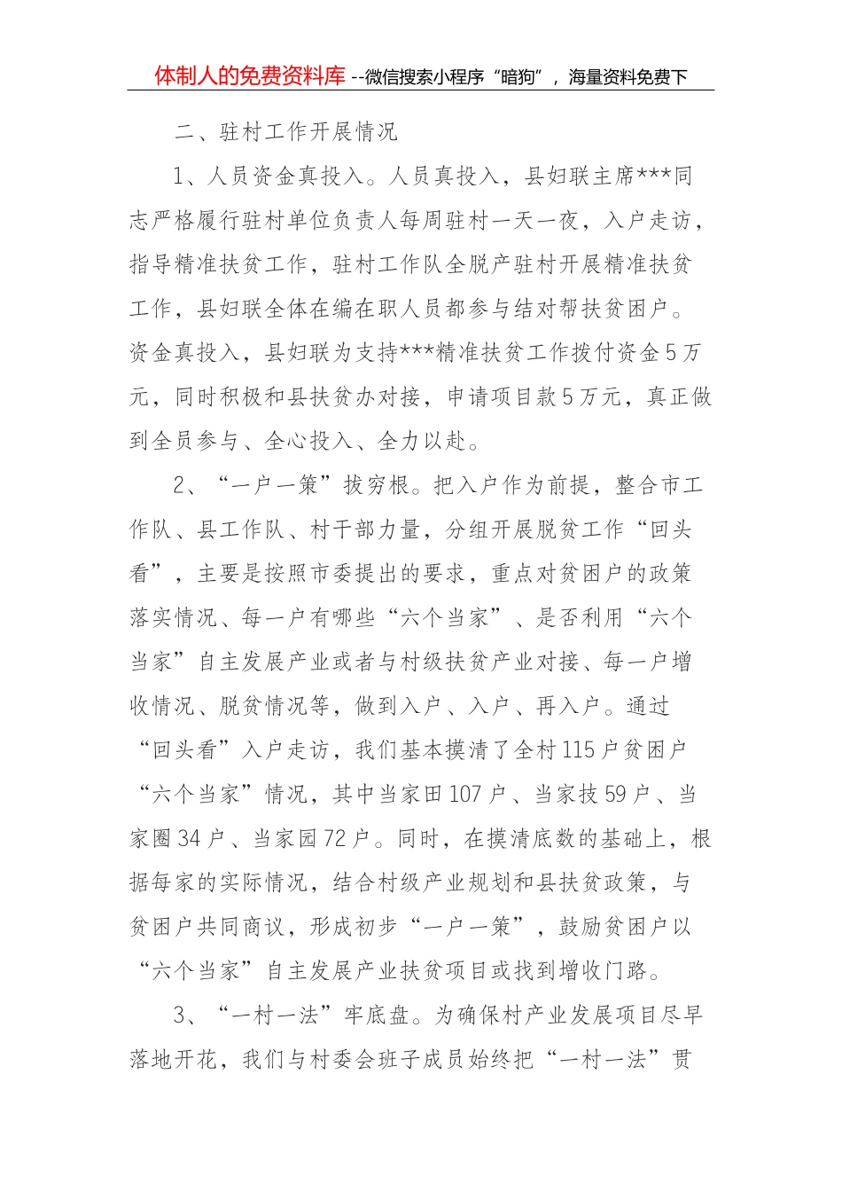 体制人的免费资料库 --微信搜索小程序“暗狗”,海量资料免费下 妇联精准扶贫驻村工作总结汇报材料 一年来,县妇联精准扶贫驻村工作队按照县委、县政府工作安排,驻点***村,在镇党委、政府的正确领导下,按照...
