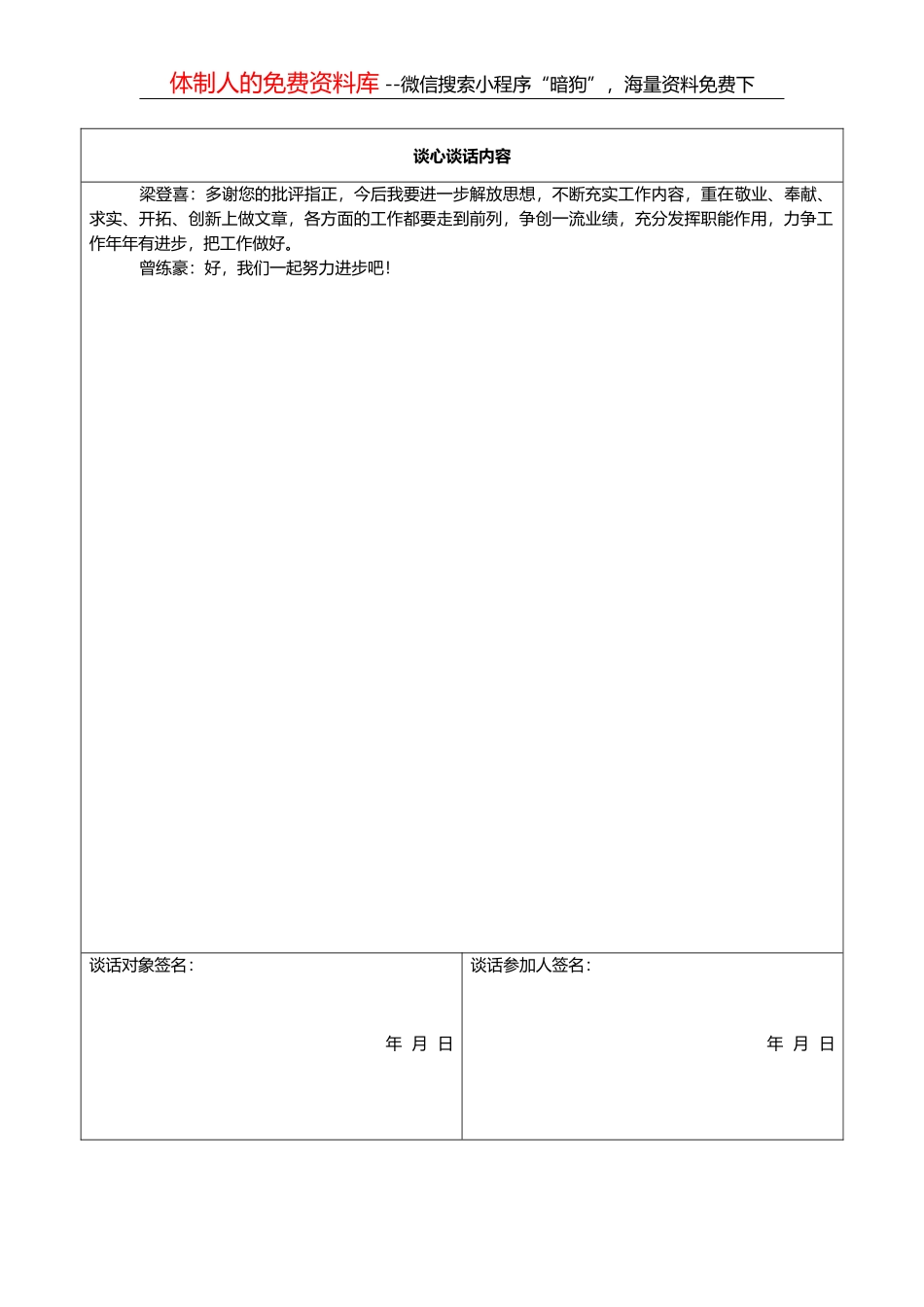 体制人的免费资料库 --微信搜索小程序“暗狗”,海量资料免费下谈心谈话记录表单位:**** 谈心谈话主 题2020 年度党员领导干部民主生活会谈心谈话谈话对象****单位职务及政治面貌****谈话人****单位职务****...