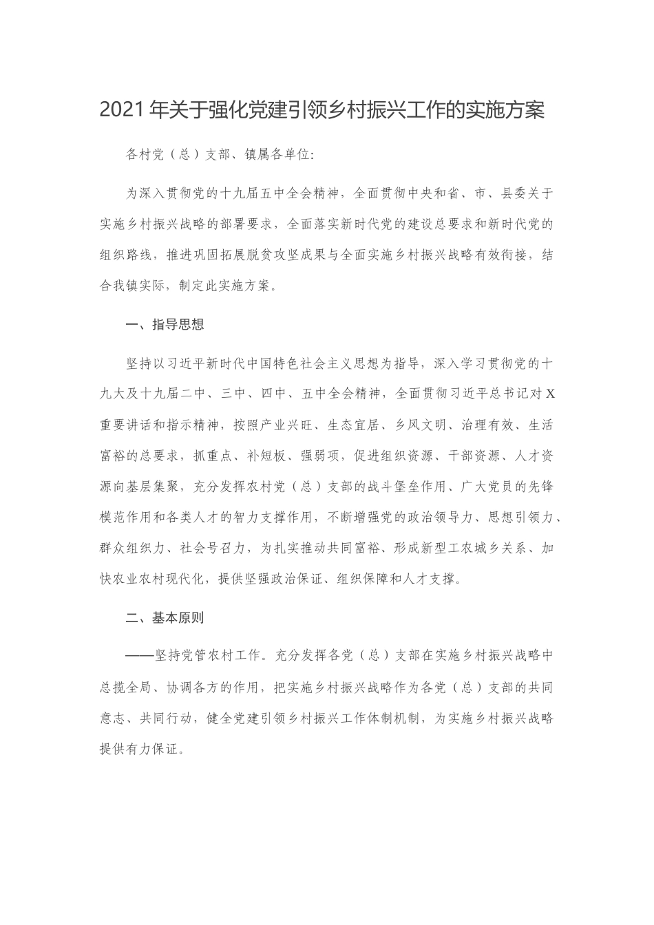 2021 年关于强化党建引领乡村振兴工作的实施方案各村党(总)支部、镇属各单位:为深入贯彻党的十九届五中全会精神,全面贯彻中央和省、市、县委关于实施乡村振兴战略的部署要求,全面落实新时代党的建设总要求...