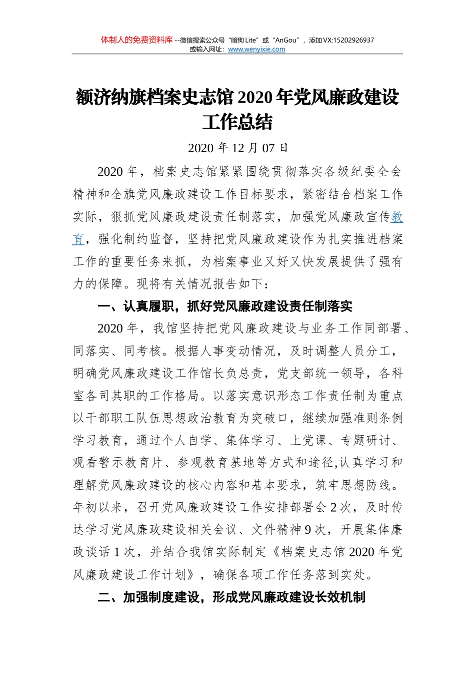 体制人的免费资料库 --微信搜索公众号“暗狗 Lite”或“AnGou”,添加 VX:15202926937或输入网址:www.wenyixie.com额济纳旗档案史志馆 2020 年党风廉政建设工作总结 2020 年 12 月 07 日2020 年,档...