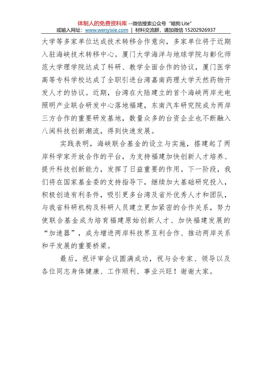 体制人的免费资料库 --微信搜索公众号“暗狗 Lite”或输入网址:www.wenyixie .com | 材料交流群,请加微信 15202926937 在海峡联合基金评审会议开幕式上的讲话陈秋立尊敬的杨卫主任,高瑞平副主任,各位...