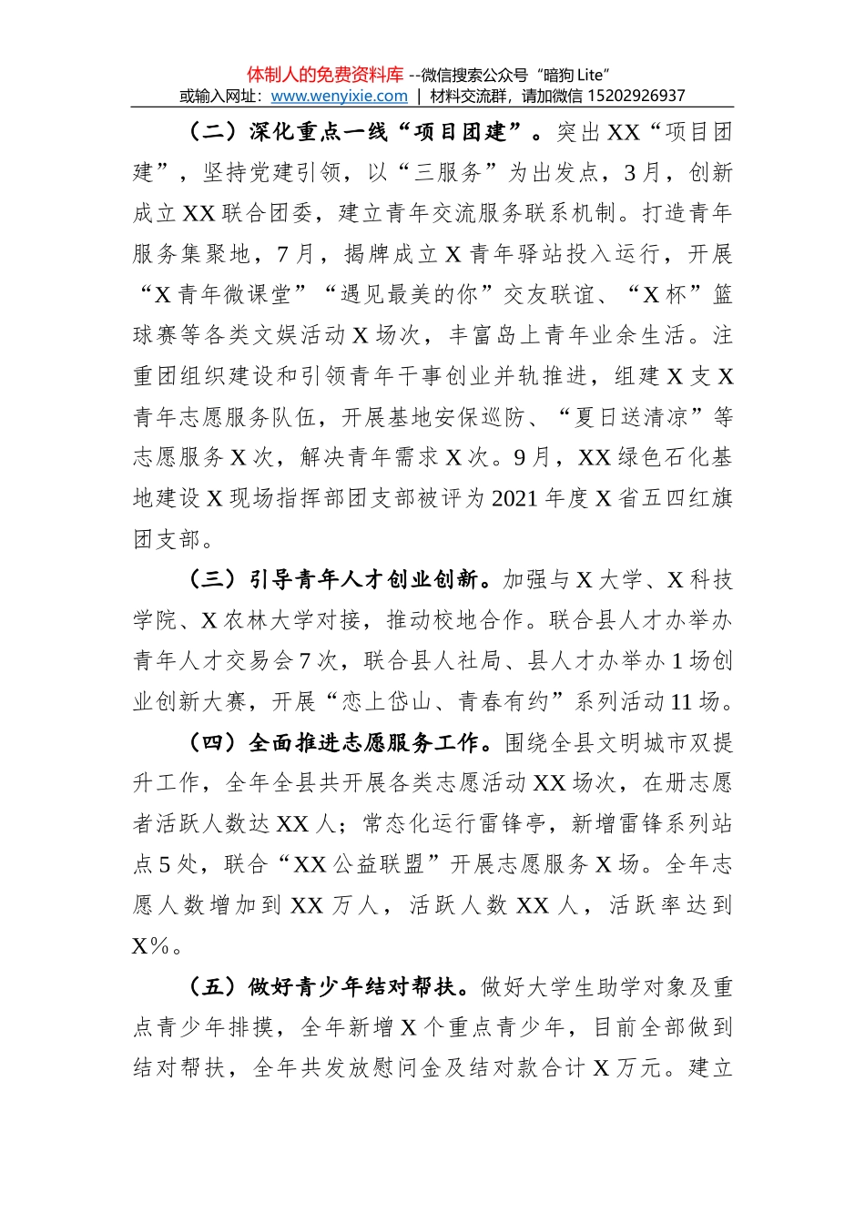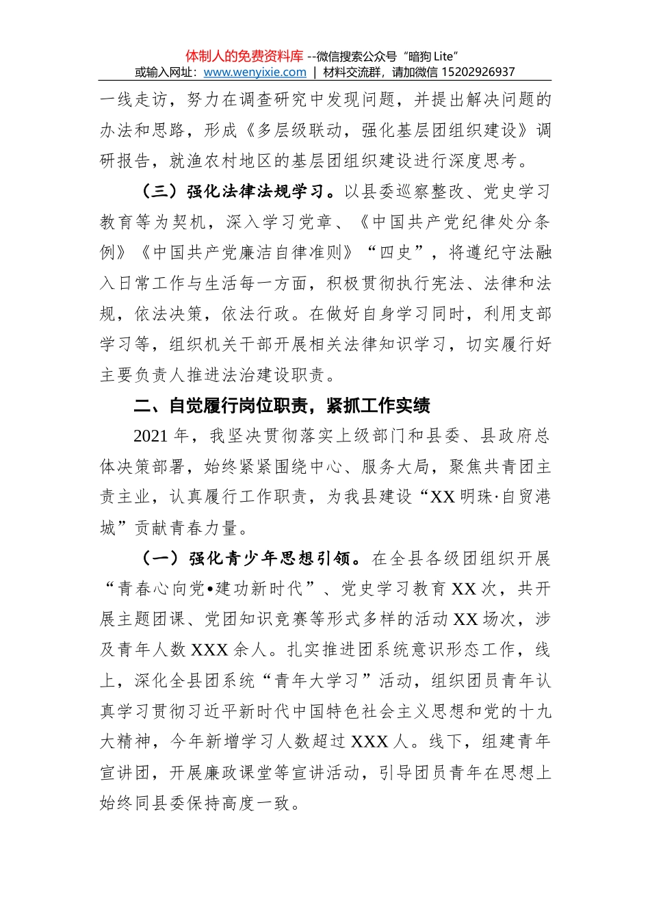 体制人的免费资料库 --微信搜索公众号“暗狗 Lite”或输入网址:www.wenyixie .com | 材料交流群,请加微信 15202926937团委书记述职述廉述德述法报告2021 年,在县委、县政府的正确领导和上级部门的关心...