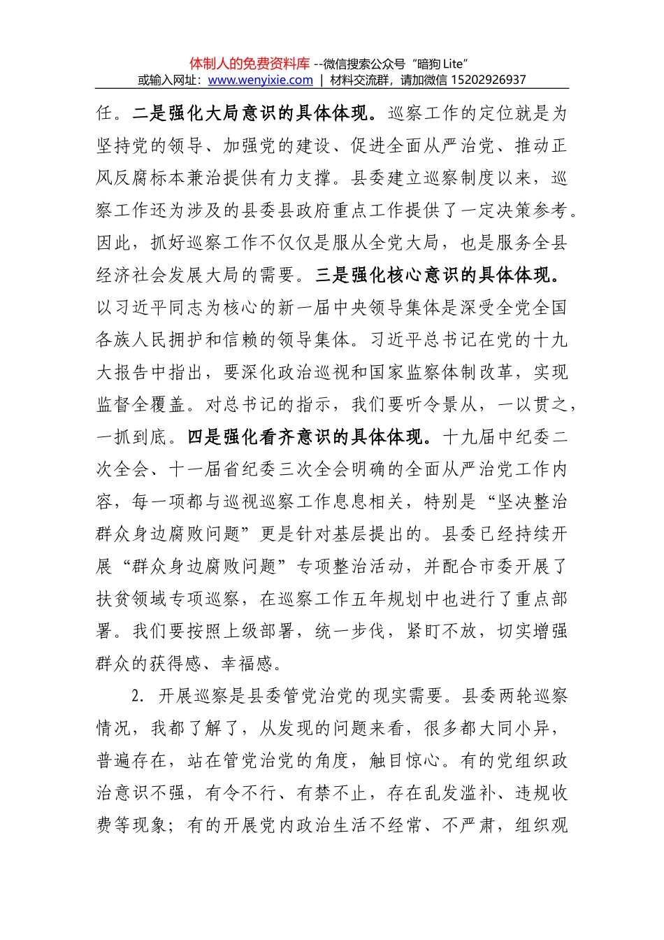 体制人的免费资料库 --微信搜索公众号“暗狗 Lite”或输入网址:www.wenyixie .com | 材料交流群,请加微信 15202926937在县委第二轮巡察情况汇报会上的讲话陈章杰(2018 年 2 月 7 日) 同志们:刚...