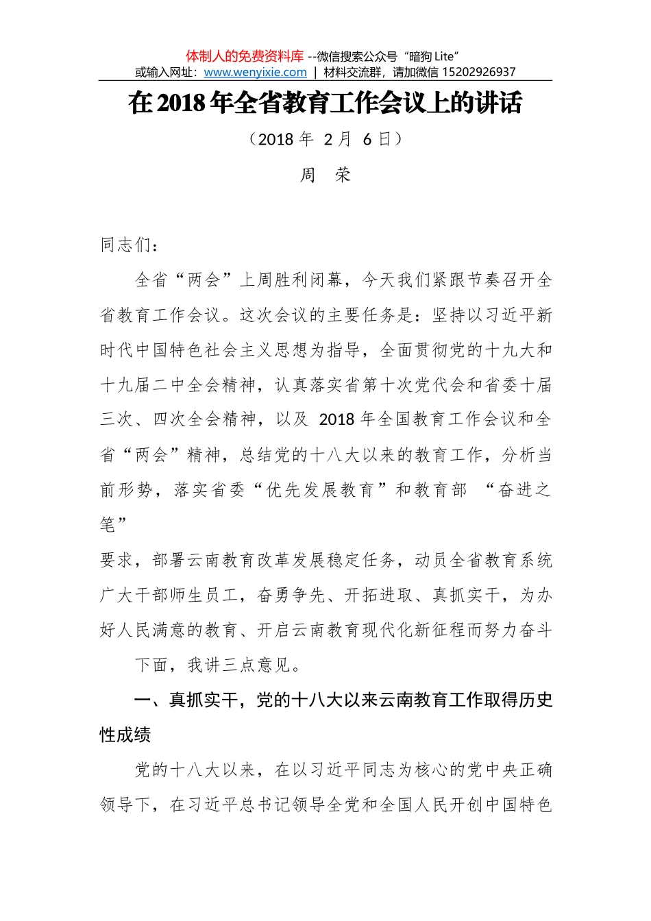 体制人的免费资料库 --微信搜索公众号“暗狗 Lite”或输入网址:www.wenyixie .com | 材料交流群,请加微信 15202926937在 2018 年全省教育工作会议上的讲话(2018 年 2 月 6 日)周 荣同志们: ...