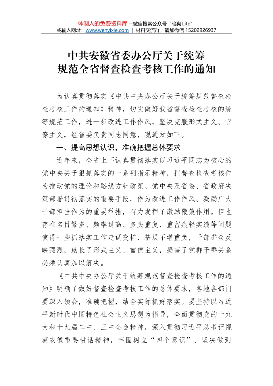 体制人的免费资料库 --微信搜索公众号“暗狗 Lite”或输入网址:www.wenyixie .com | 材料交流群,请加微信 15202926937中共安徽省委办公厅关于统筹规范全省督查检查考核工作的通知为认真贯彻落实《中共中...