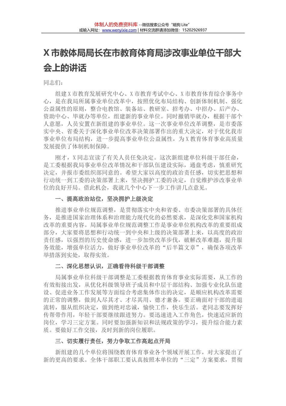体制人的免费资料库 --微信搜索公众号“暗狗 Lite”或输入网址:www.wenyixie.com | 材料交流群请添加微信:15202926937X 市教体局局长在市教育体育局涉改事业单位干部大会上的讲话同志们:组建 X 市教育...