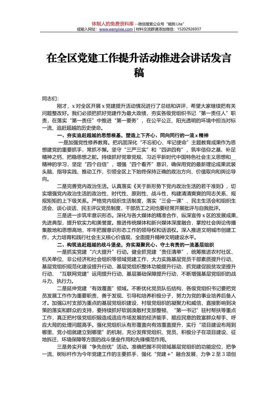 体制人的免费资料库 --微信搜索公众号“暗狗 Lite”或输入网址:www.wenyixie.com | 材料交流群请添加微信:15202926937在全区党建工作提升活动推进会讲话发言稿 同志们:刚才,x 对全区开展 x 党建提升...