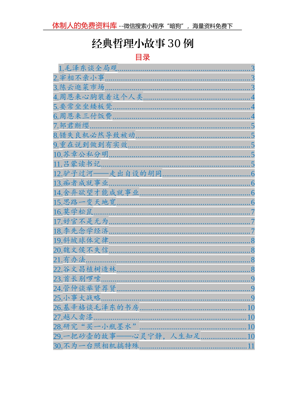 体制人的免费资料库 --微信搜索小程序“暗狗”,海量资料免费下体制人的免费资料库 --微信搜索小程序“暗狗”,海量资料免费下经典哲理小故事 30 例目录1.毛泽东谈全局观......................................