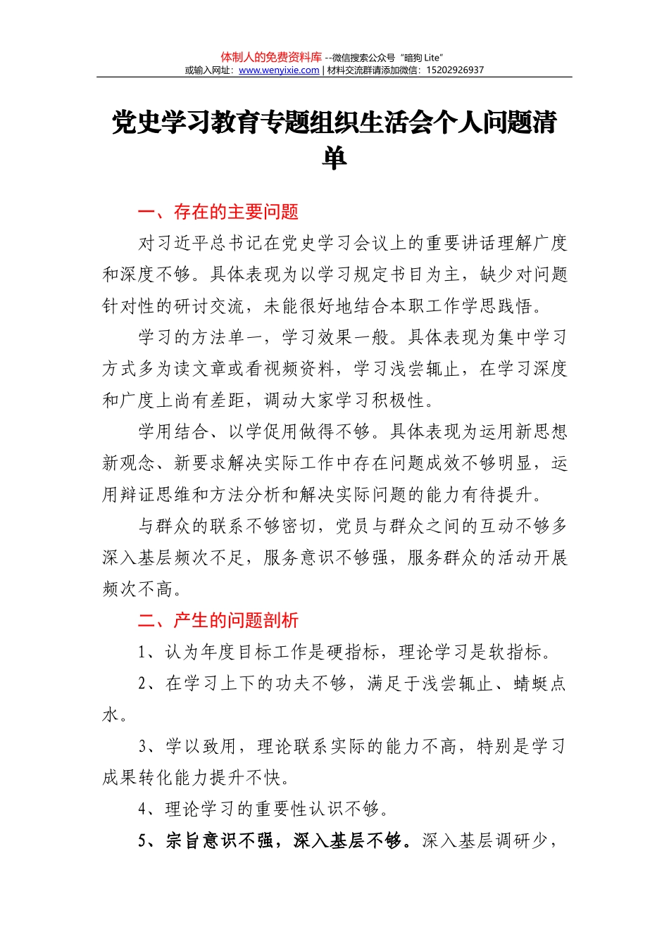 体制人的免费资料库 --微信搜索公众号“暗狗 Lite”或输入网址:www.wenyixie.com | 材料交流群请添加微信:15202926937党史学习教育专题组织生活会个人问题清单一、存在的主要问题对习近平总书记在党史学习...