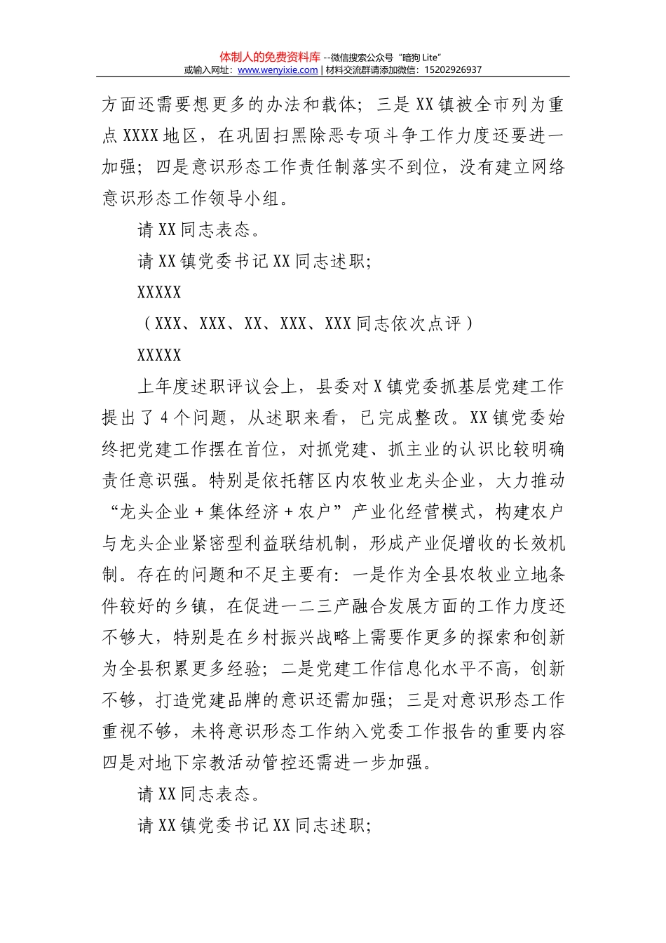 体制人的免费资料库 --微信搜索公众号“暗狗 Lite”或输入网址:www.wenyixie.com | 材料交流群请添加微信:15202926937全县党组织书记抓基层党建述职评议考核会主持讲话同志们:今天,我们召开全县党组织书...