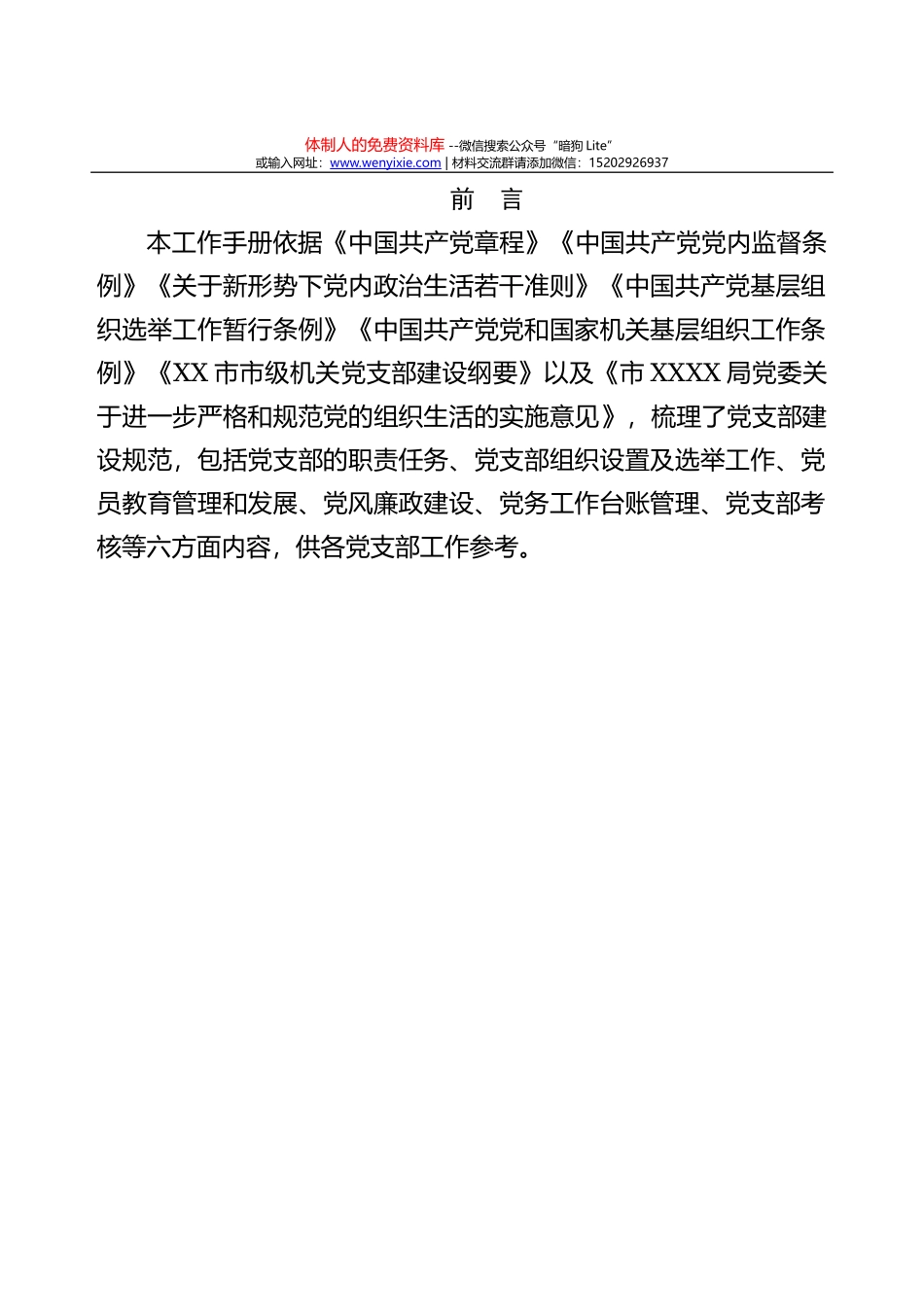 体制人的免费资料库 --微信搜索小程序“暗狗”,海量资料免费下关注【公文思享】获赠百万写作素材机关党支部规范化建设工作手册XXXXXXXXXXX 年 X 月体制人的免费资料库 --微信搜索公众号“暗狗 Lite”或输...