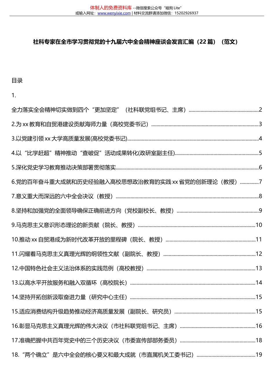 体制人的免费资料库 --微信搜索公众号“暗狗 Lite”或输入网址:www.wenyixie.com | 材料交流群请添加微信:15202926937社科专家在全市学习贯彻党的十九届六中全会精神座谈会发言汇编(22 篇)(范文)目录1...