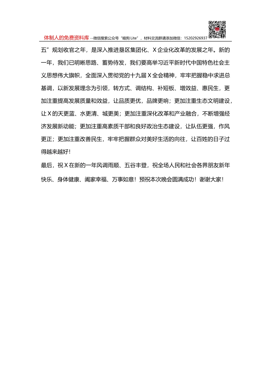 体制人的免费资料库 --微信搜索公众号“暗狗 Lite”,材料交流群请添加微信:15202926937元旦晚会致辞人喜盛世,虎兆丰年,在这普天同庆,万家团圆的美好时刻,我谨代表 X党委、X、X 党政班子,向全场干部群...
